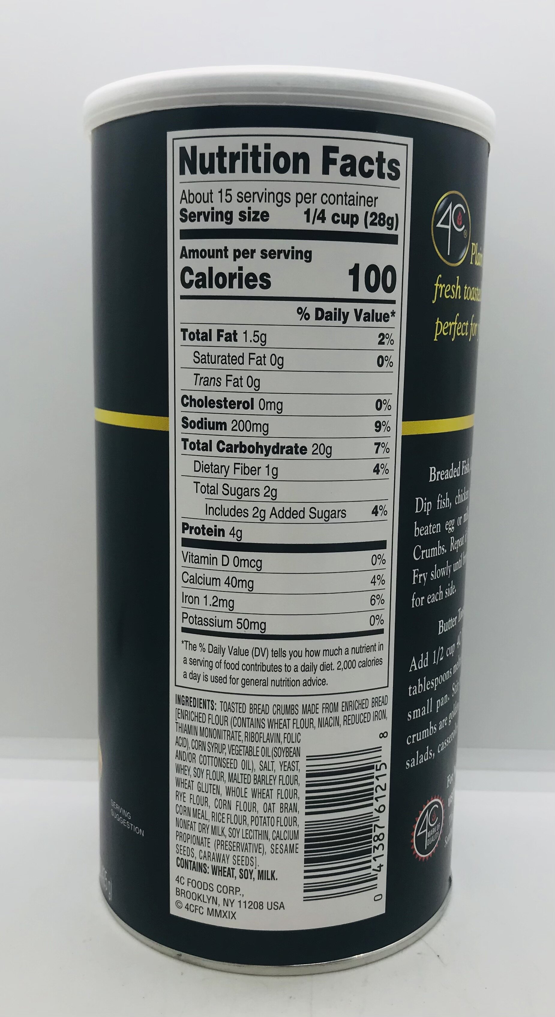 TOASTED BREAD CRUMBS MADE FROM ENRICHED BREAD ENRICHED FLOUR (CONTAINS WHEAT FLOUR, NIACIN, REDUCED IRON, THIAMIN MONONITRATE, RIBOFLAVIN, FOLIC ACID), CORN SYRUP, VEGETABLE OIL (SOYBEAN AND/OR COTTONSEED OIL), SALT, YEAST, WHEY, SOY FLOUR, MALTED BARLEY FLOUR, WHEAT GLUTEN, WHOLE WHEAT FLOUR, RYE FLOUR, CORN FLOUR, OAT BRAN, CORN MEAL, RICE FLOUR, POTATO FLOUR, NONFAT DRY MILK, SOY LECITHIN, CALCIUM PROPIONATE (PRESERVATIVE), SESAME SEEDS, CARAWAY SEEDS). CONTAINS: WHEAT, SOY, MILK.