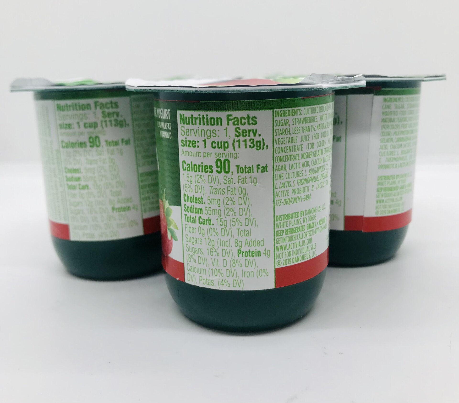Cultured reduced fat milk, cane sugar, water, strawberries, modified food starch, less than 1%: natural flavors, fruit & vegetable juice, Fruit juice concentrate, kosher gelatin, Agar agar, Lactic acid, calcium lactate, vitamin D3.