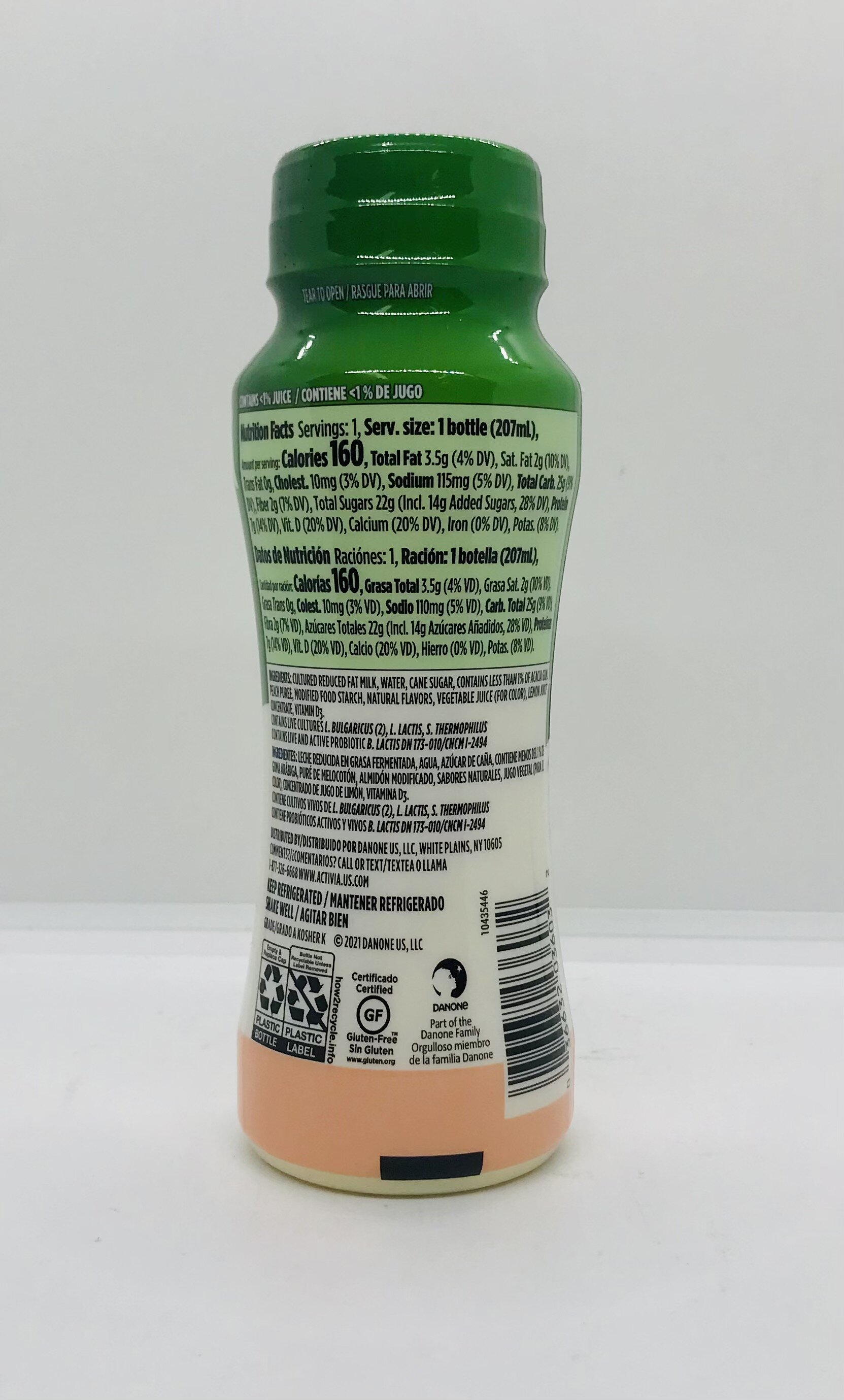 Cultured reduced fat milk, water, cane sugar, contains less than 1% of acacia gum, peach puree, modified food starch, natural flavors, vegetable juice, lemon juice concentrate, vitamin D3.