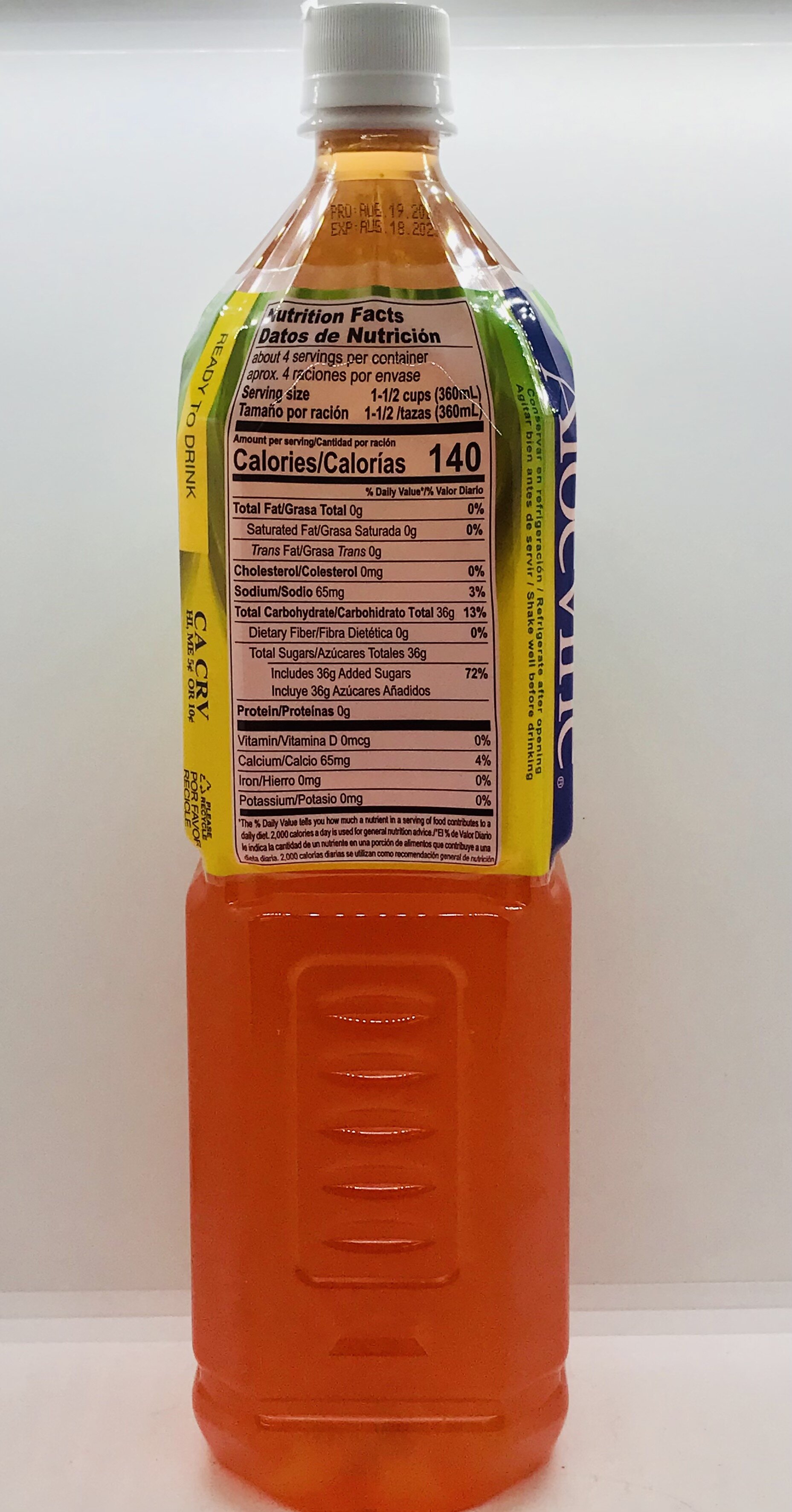Purified water, aloe vera gel, fructose, sugar, citric acid, natural and artificial pomegranate flavor, calcium lactase, sodium citrate, vitamin C, gellan gum, cochineal extract, tumeric extract, B-carotene.