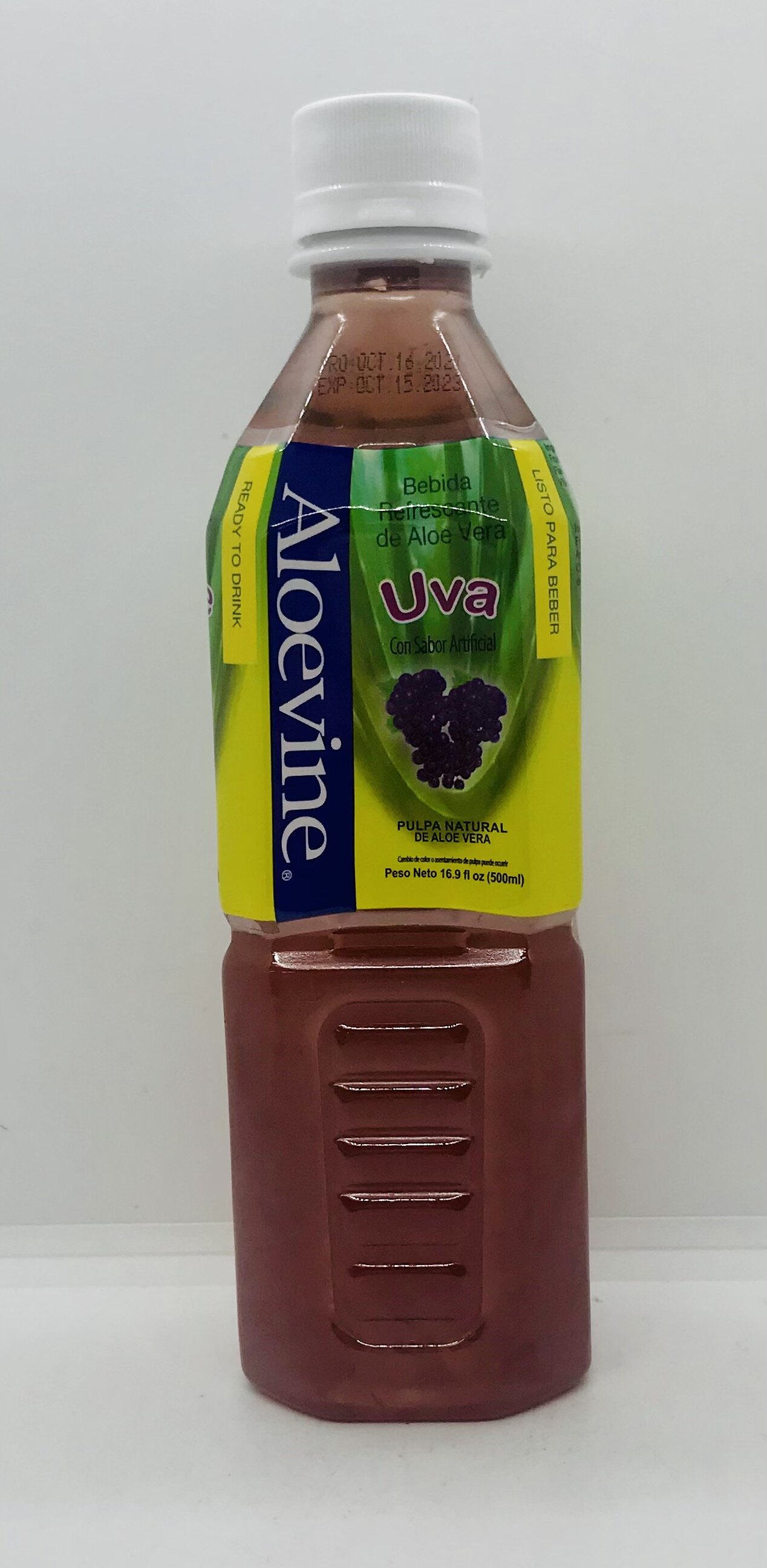 Purified water, aloe vera gel (8%), fructose, sugar, citric acid, calcium lactate, grape skin extract, artificial grape flavor, sodium citrate, vitamin C, gellan  gum, caramel extract.