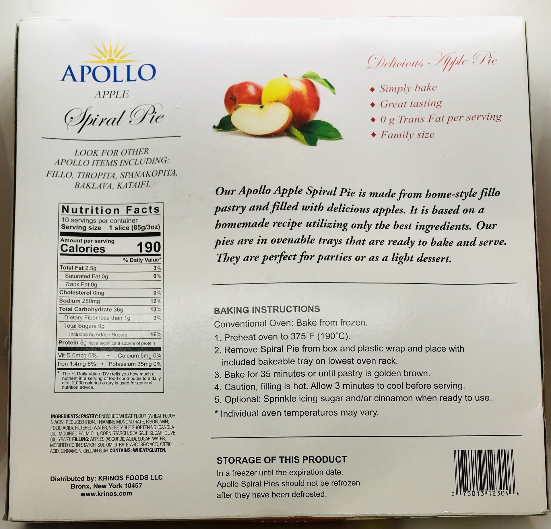 ENRICHED WHEAT FLOUR (WHEAT FLOUR. NIACIN, REDUCED IRON, THIAMINE MONONITRATE, RIBOFLAVIN. FOLIC ACID), FILTERED WATER, VEGETABLE SHORTENING (CANOLA OIL, MODIFIED PALM OIL), CORN STARCH, SEA SALT, SUGAR, OLIVE OIL, YEAST FILLING: APPLES (ASCORBIC ACID), SUGAR, WATER MODIFIED CORN STARCH, SODIUM CITRATE, ASCORBIC ACID, CITRIC ACID, CINNAMON, GELLAN GUM.