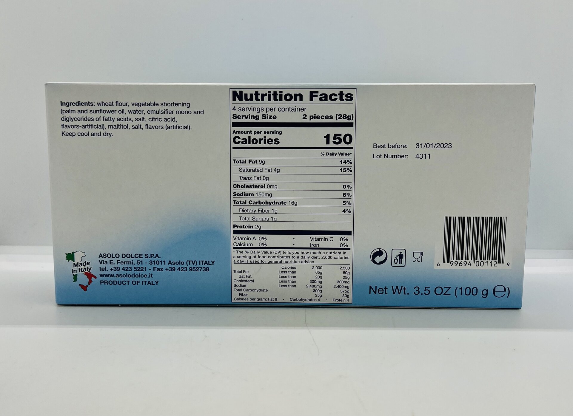 Ingredients: wheat flour, vegetable shortening (palm and sunflower oil, water, emulsifier mono and diglycerides of fatty acids, salt, citric acid, flavors-artificial), maltitol, salt, flavors (artificial) .