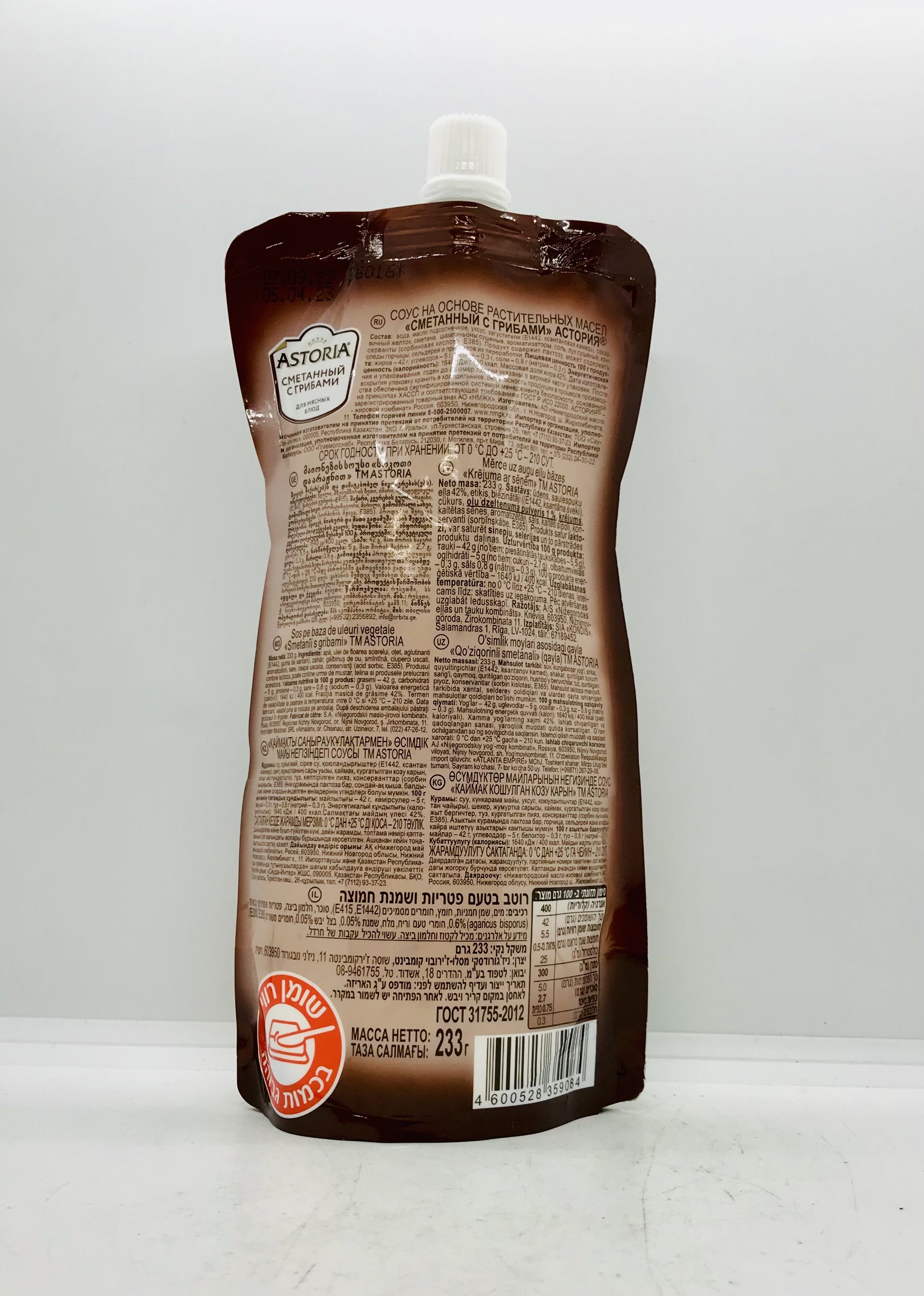 Water, sunflower oil, vinegar, sugar, thickener - modified corn starch, flavors, egg yolk, salt, dried mushrooms, preservatives (sorbic acid, E385), dried onions, sour cream. The product contains lactose.