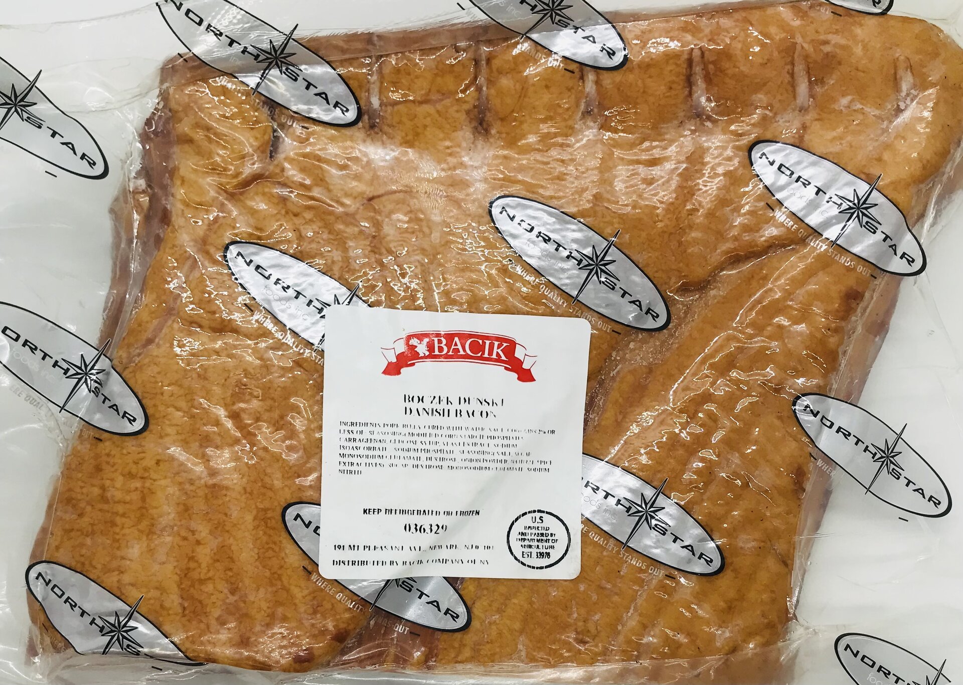 Pork belly cured with water, salt, contains 2% or less of seasonings modified corn starch phosphates, carrageenan, glucose syrup, east extract, sodium isoascorbate, sodium phosphate, seasoning (salt, sugar, monosodium glutamate, dextrose, onion powder, natural spice extractives).