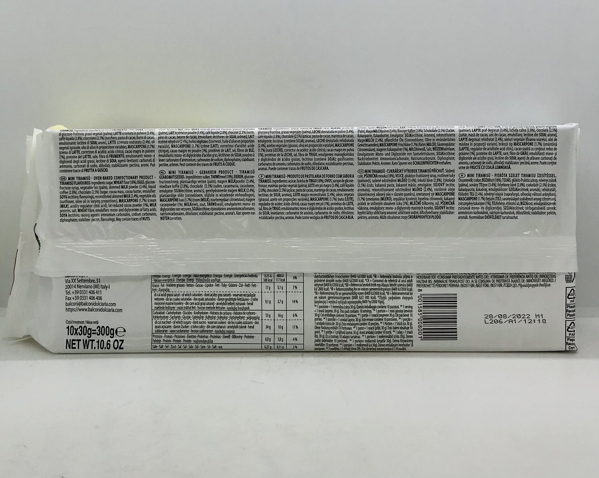 Sugar, WHEAT flour (18%), EGGS, glucose fructose syrup, vegetable fats (palm), skimmed MILK powder (3.4%), liquid coffee (2.8%), chocolate (2.5%) (sugar, cocoa mass, cocoa butter, emulsifier: SOYA lecithins; flavourings), reconstituted skimmed MILK (2.4%), vegetable oils (sunflower, olive oil in varying proportions), MASCARPONE (1.7%) (cream (MILK), acidity regulator: citric acid), fat-reduced cocoa powder (1%), MILK proteins, salt, WHEAT fibre, emulsifiers: mono- and diglycerides of fatty acids, SOYA lecithins; raising agents: ammonium carbonates, sodium carbonates, diphosphates; stabilizer: pectin, flavourings.
