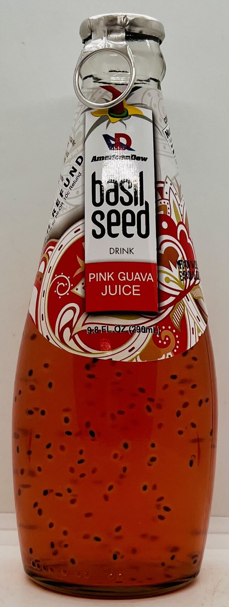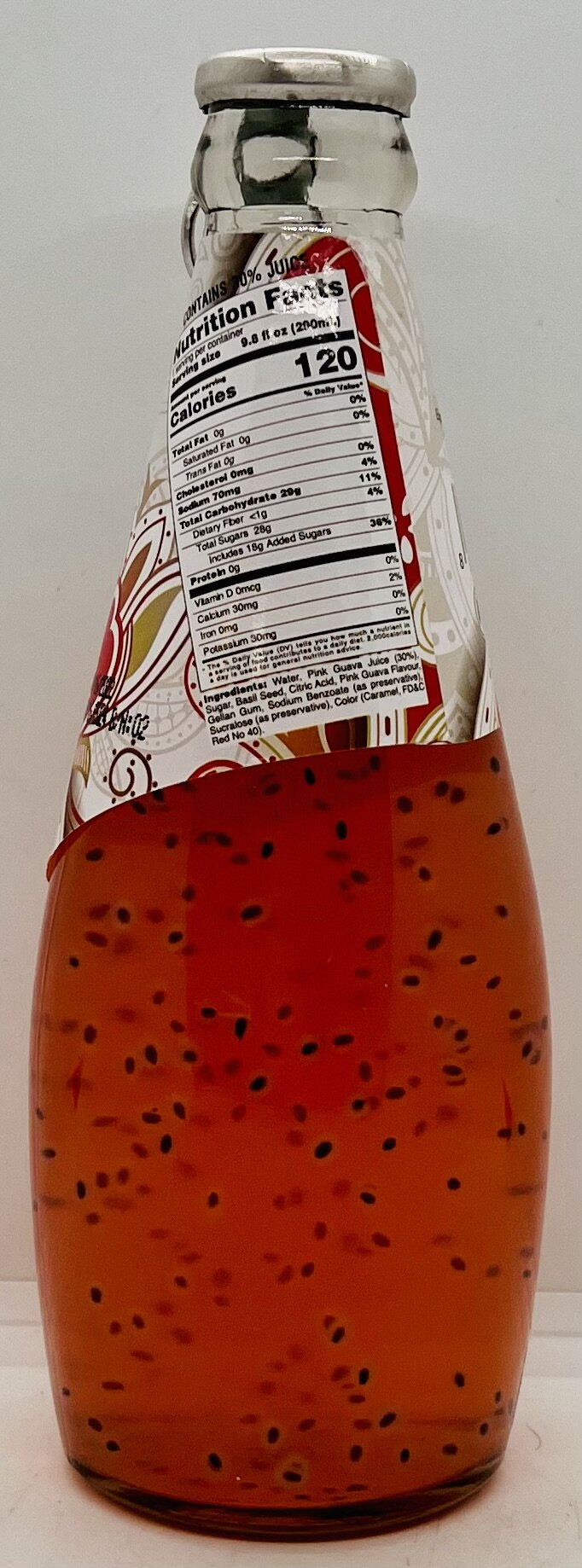 Water, Pink Guava Juice (30%) Sugar, Basil Seed, Citric Acid, Pink Guava Flavour Gellan Gum, Sodium Benzoate (as preservative). Sucralose (as preservative), Color (Caramel, FD&C Red No 40).