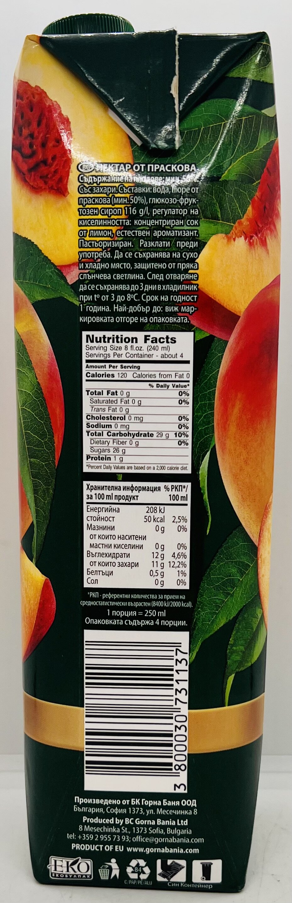 Water, peach puree (min 50%), glucose-fructose syrup 116g. acidifier: concentrated lemon juice natural flavor.