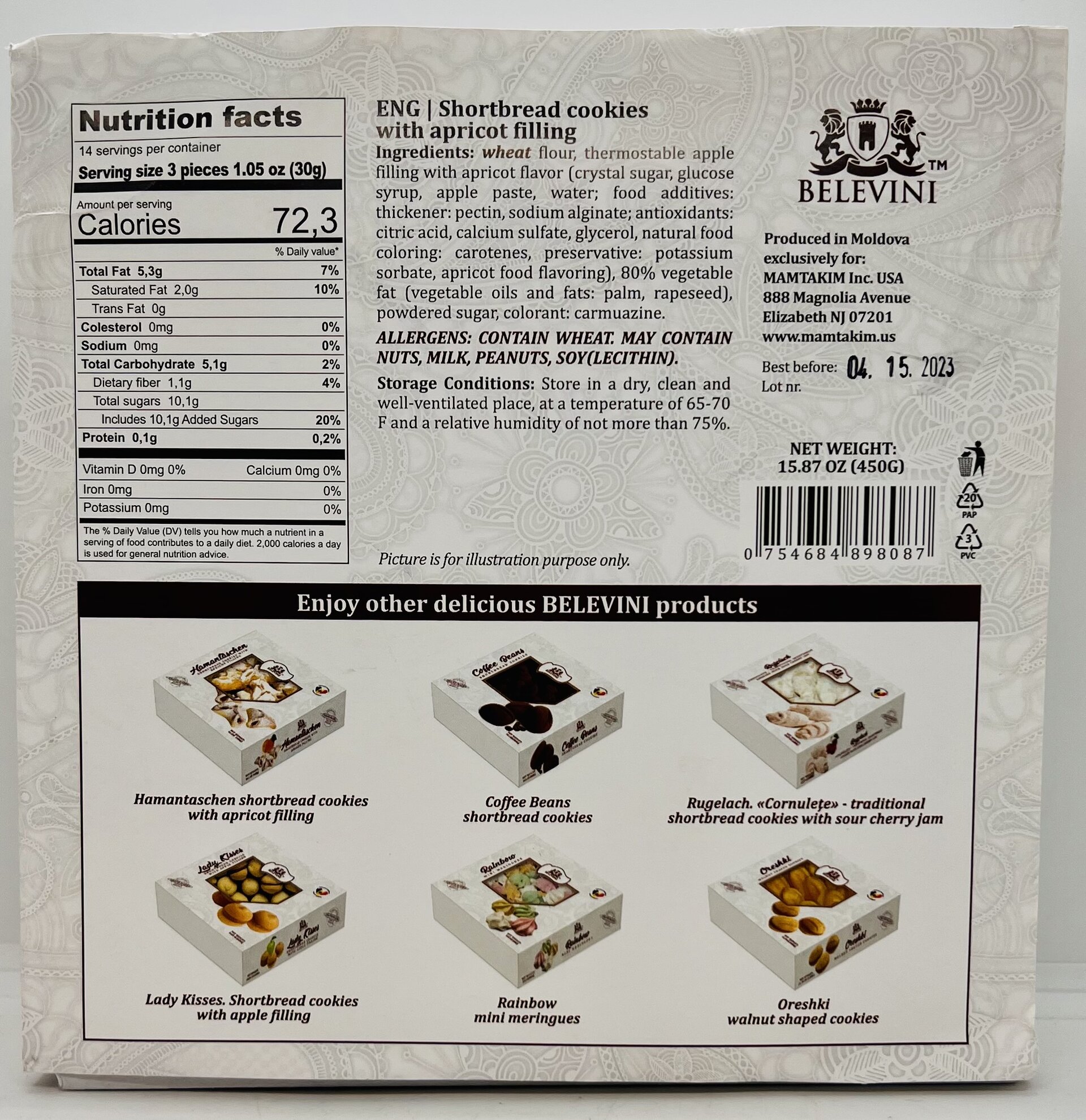 Wheat flour, thermostable apple filling with apricot flavor (crystal sugar, glucose syrup, apple paste, water; food additives: thickener: pectin, sodium alginate; antioxidants: citric acid, calcium sulfate, glycerol, natural food coloring: carotenes, preservative: potassium sorbate, apricot food flavoring), 80% vegetable fat (vegetable oils and d fats: palm, rapeseed), powdered sugar, colorant: carmuazine.