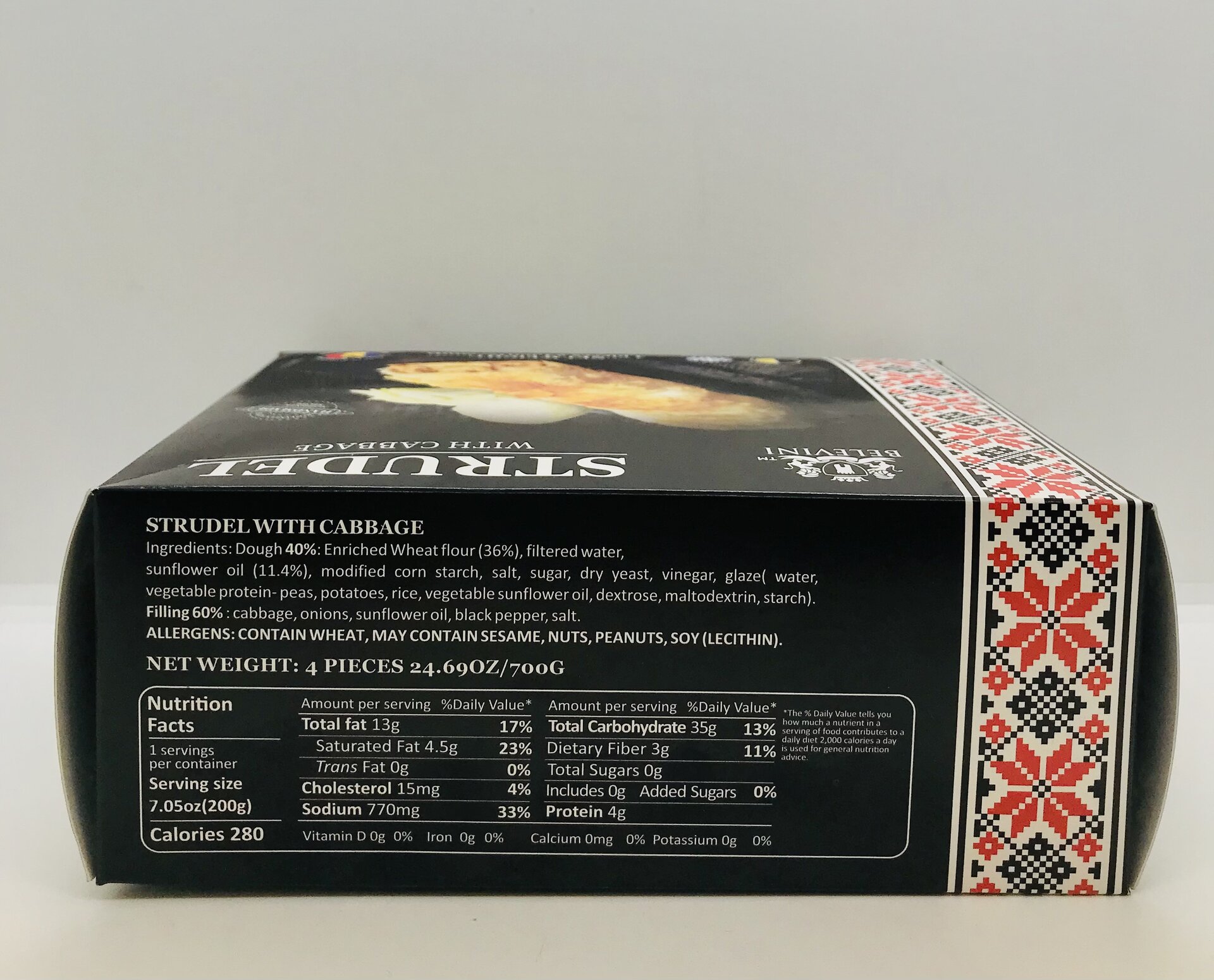 Dough 40%: Enriched Wheat flour (36%), filtered water, sunflower oil (11.4%), modified corn starch, salt, sugar, dry yeast, vinegar, glazed water, vegetable protein peas, potatoes, rice, vegetable sunflower oil, dextrose, maltodextrin, starch). Filling 60%: cabbage, onions, sunflower oil, black pepper, salt.