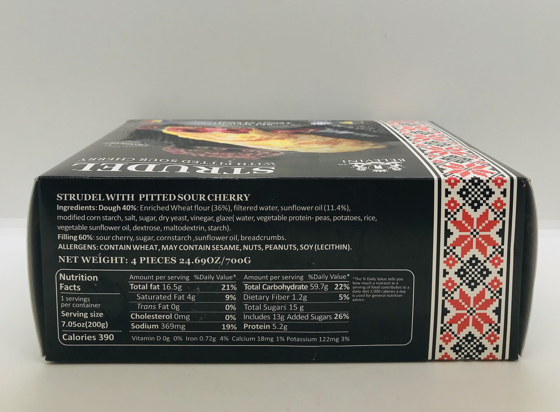 Dough 40% : Enriched Wheat flour (36%), filtered water, sunflower oil (11.4%), modified corn starch, salt, sugar, dry yeast, vinegar, glaze( water, vegetable protein-peas, potatoes, rice, vegetable sunflower oil, dextrose, maltodextrin, starch). Filling 60%: sour cherry, sugar, cornstarch, sunflower oil, breadcrumbs.