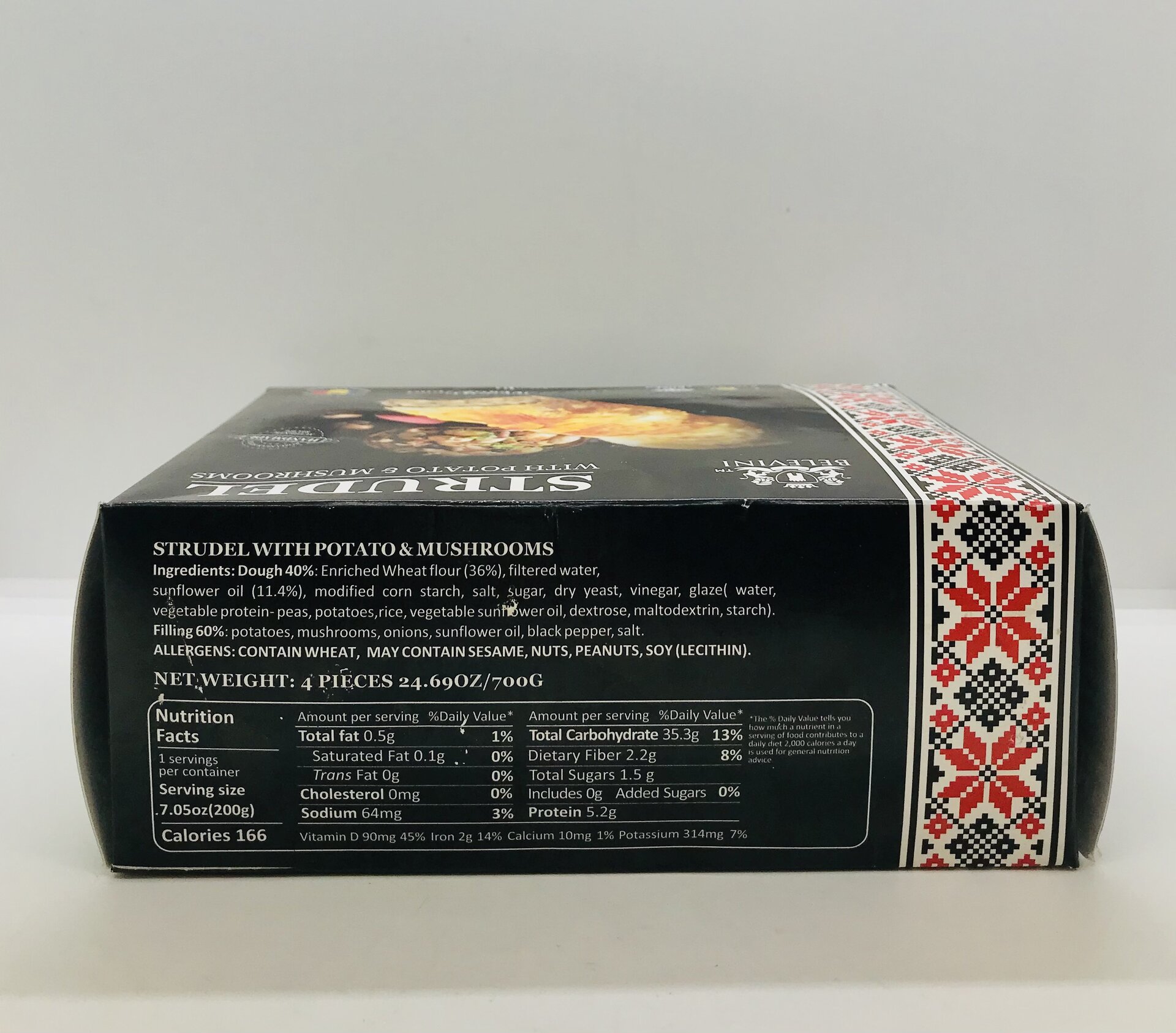 Dough 40%: Enriched Wheat flour (36%), filtered water, sunflower oil (11.4%), modified corn starch, salt, sugar, dry yeast, vinegar, glaze( water, vegetable protein-peas, potatoes, rice, vegetable surfwer oil, dextrose, maltodextrin, starch). Filling 60%: potatoes, mushrooms, onions, sunflower oil, black pepper, salt.