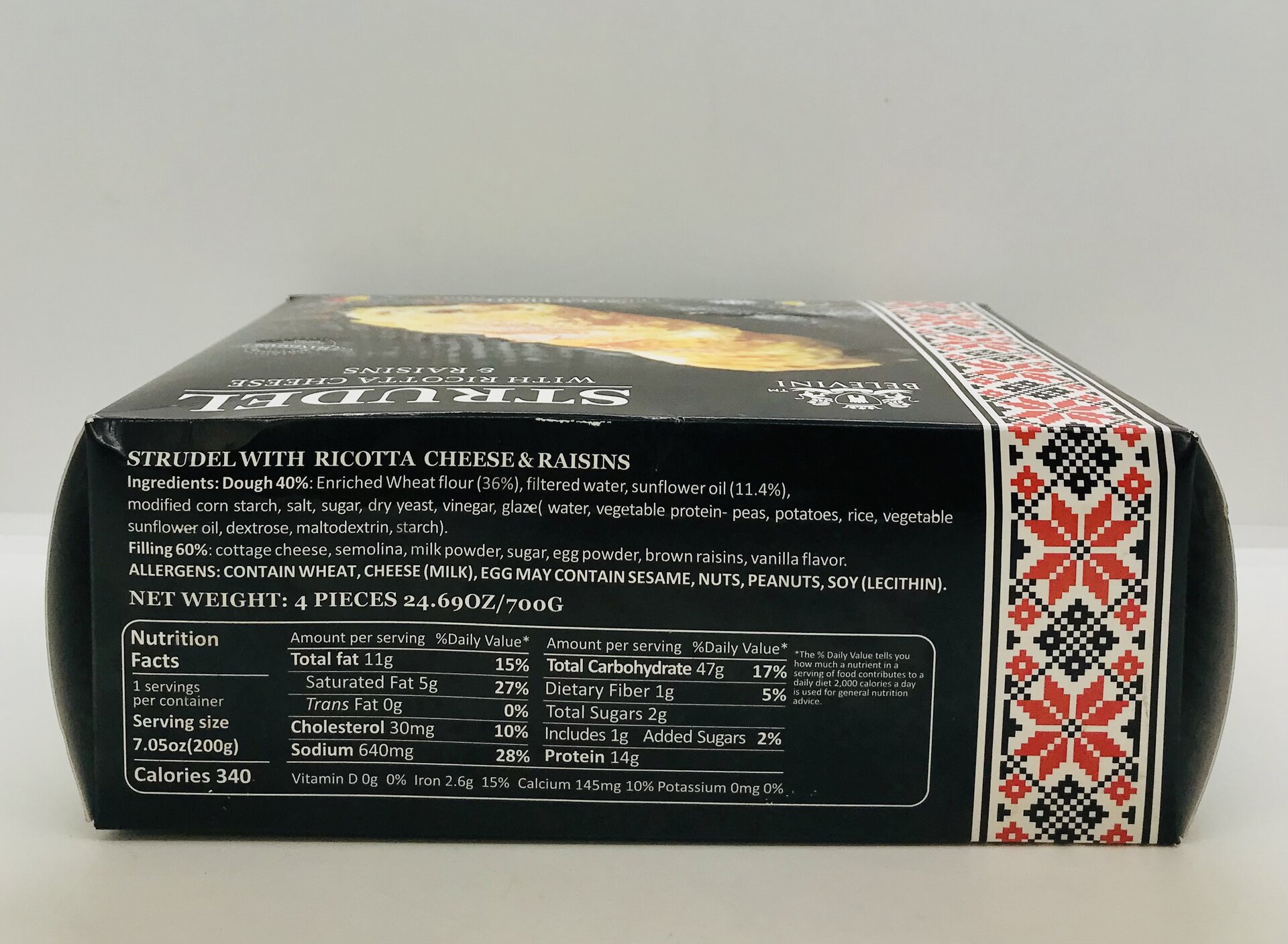 Dough 40%: Enriched Wheat flour (36%), filtered water, sunflower oil (11.4%), modified corn starch, salt, sugar, dry yeast, vinegar, glaze( water, vegetable protein-peas, potatoes, sunflower oil, dextrose, maltodextrin, starch). Filling 60%: cottage cheese, semolina, milk powder, sugar, egg powder, brown raisins, vanilla flavor. rice, vegetable.