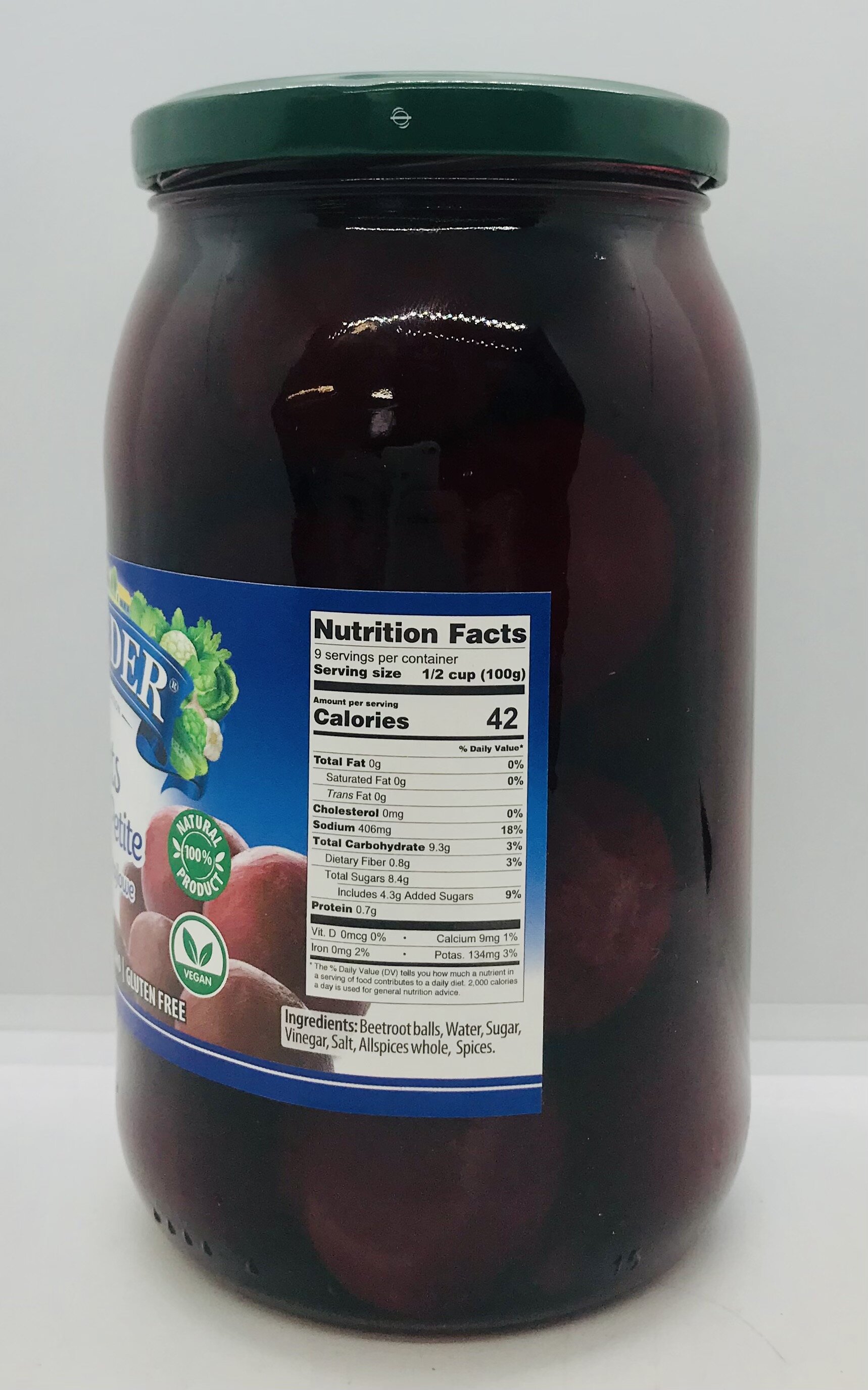 Beetroot balls, water, sugar, vinegar, salt, allspices whole, spices.