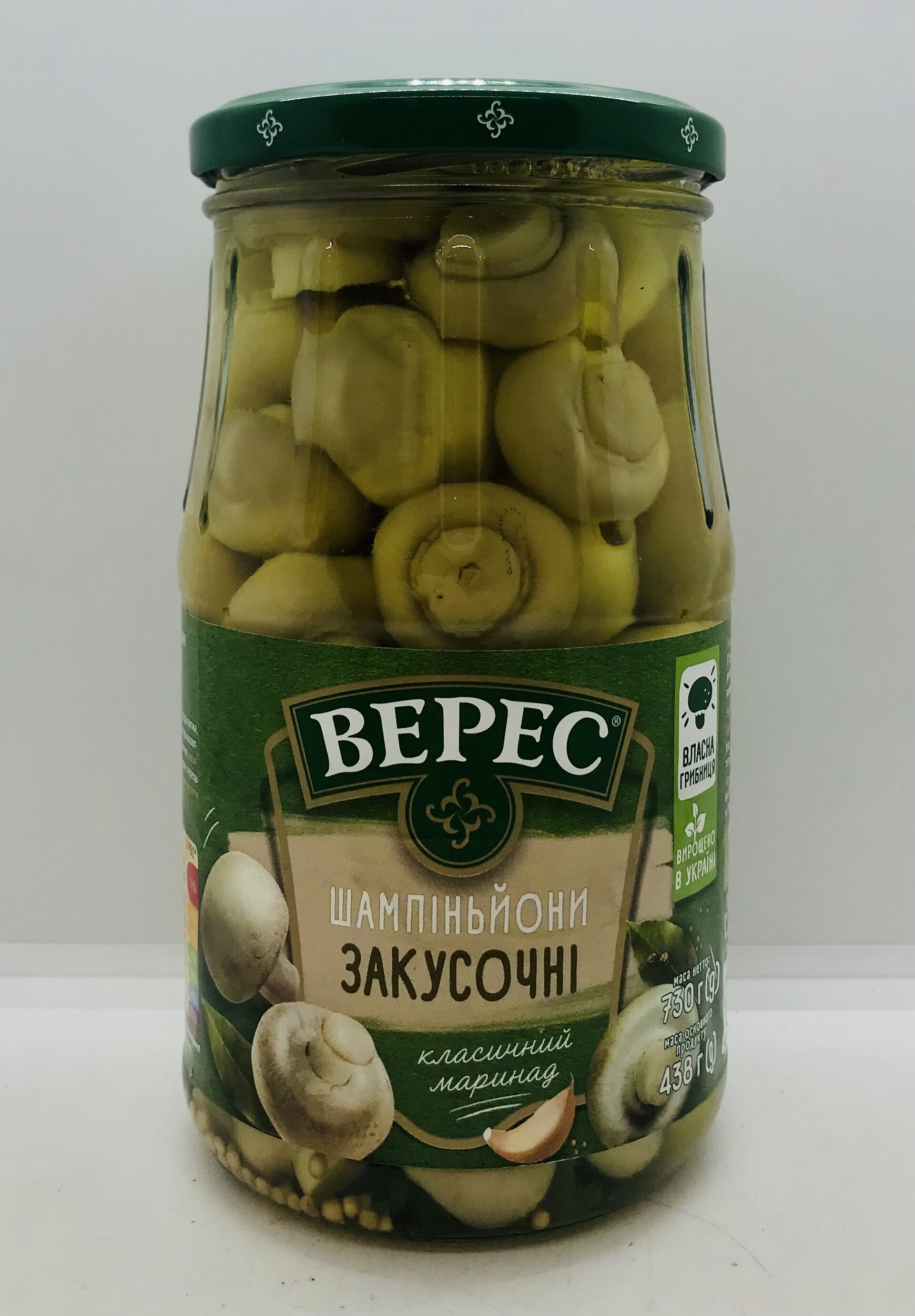 Mushrooms (56%), water, salt, sugar, garlic, acetic acid, citric acid, mustard seeds, allspice, black pepper, bay leaves.