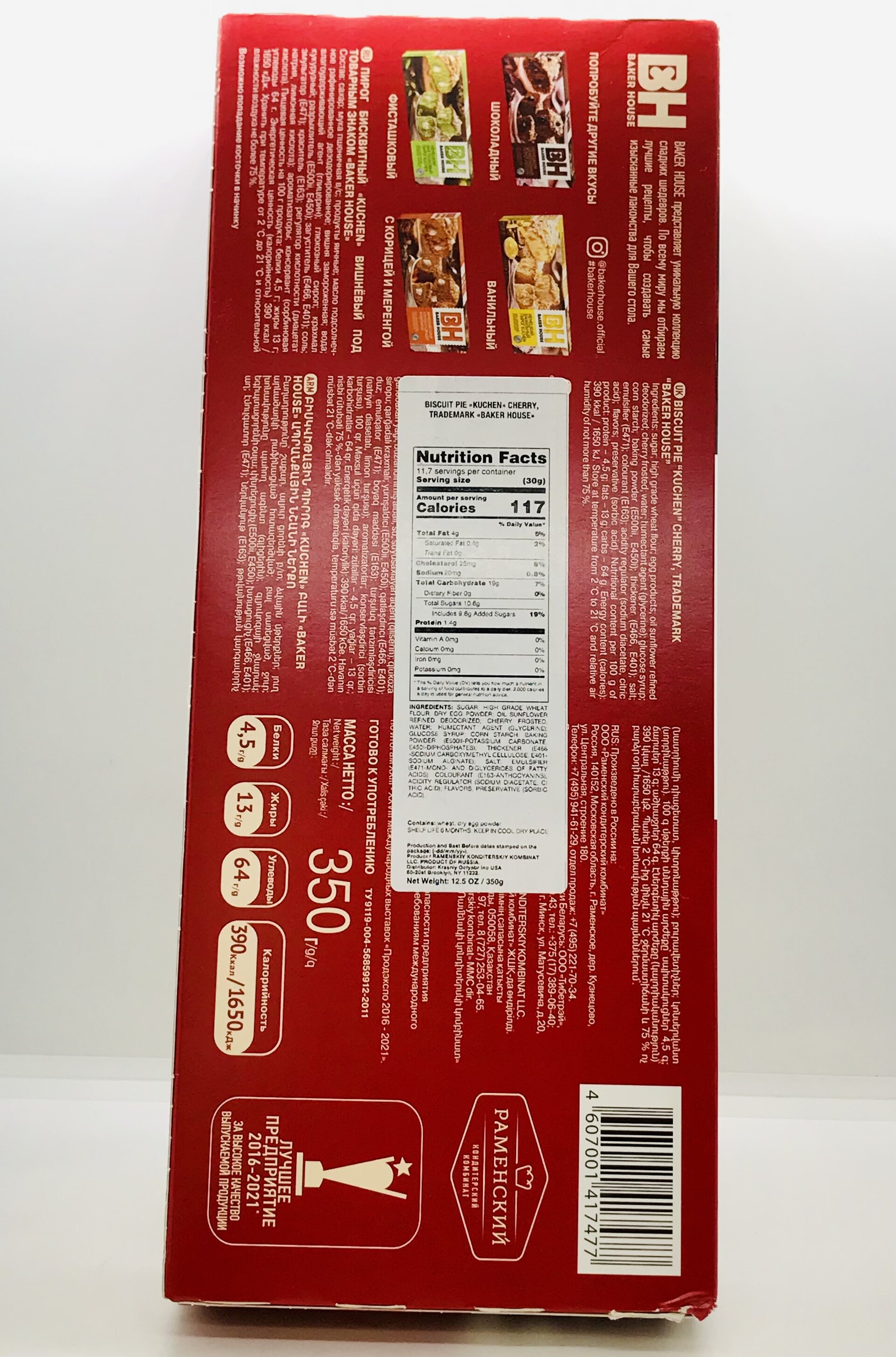 SUGAR: HIGH GRADE WHEAT FLOUR: DRY EGG POWDER, OIL SUNFLOWER REFINED DEODORIZED; CHERRY FROSTED GLUCOSE SYRUP CORN STARCH, BAKING POWDER (E50011-POTASSIUM CARBONATE. E4501-DIPHOSPHATES): THICKENER (E466 SODIUM CARBOXYMETHYL CELLULOSE (E471-MONO- AND DIGLYCERIDES OF FATTY ACIDS). COLOURANT (E163-ANTHOCYANINS). TRIC ACIDI FLAVORS, PRESERVATIVE (SORBIC ACID).