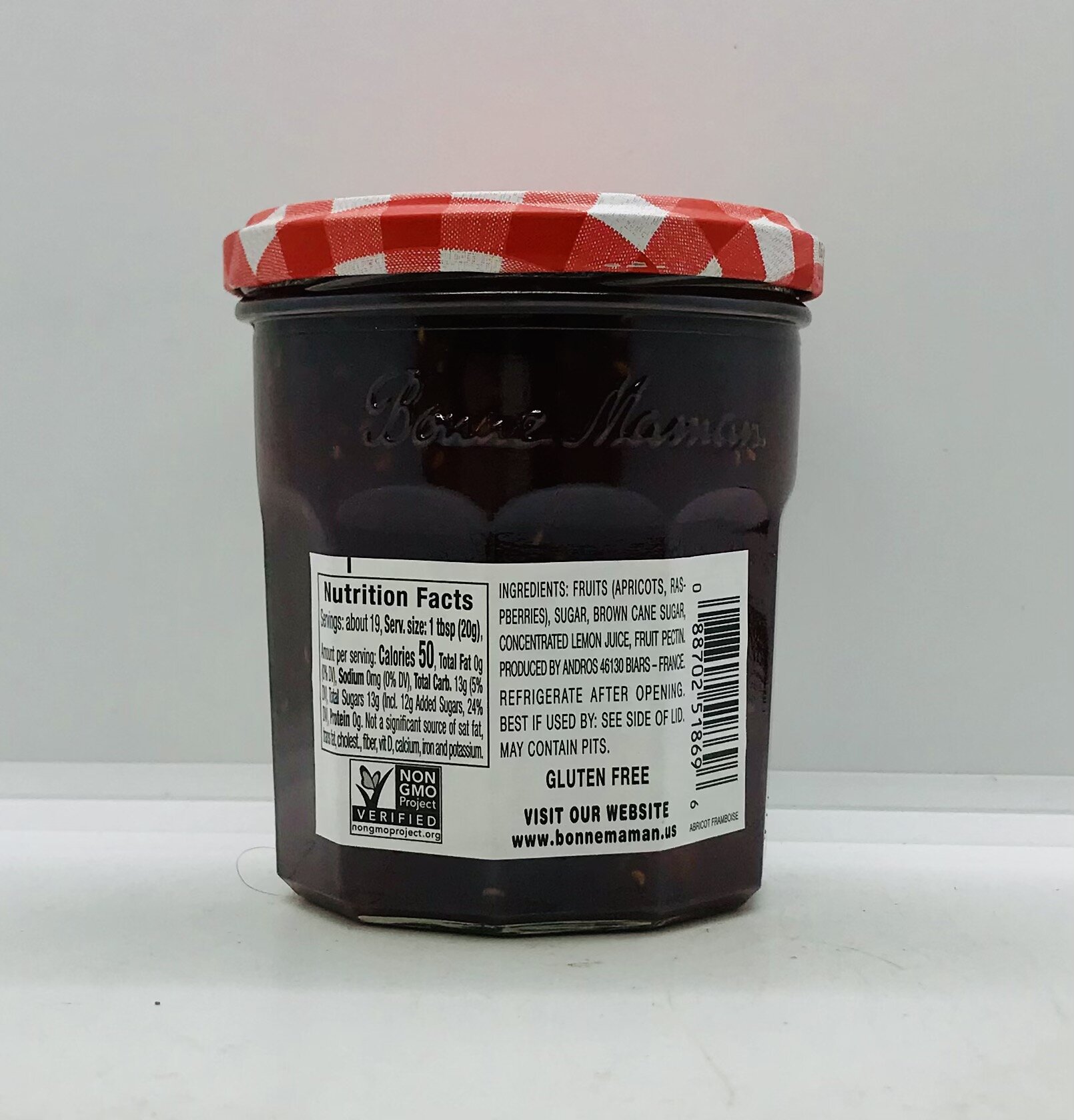 Fruits (apricots, raspberries), sugar, brown cane sugar, concentrated lemon juice, fruit pectin.