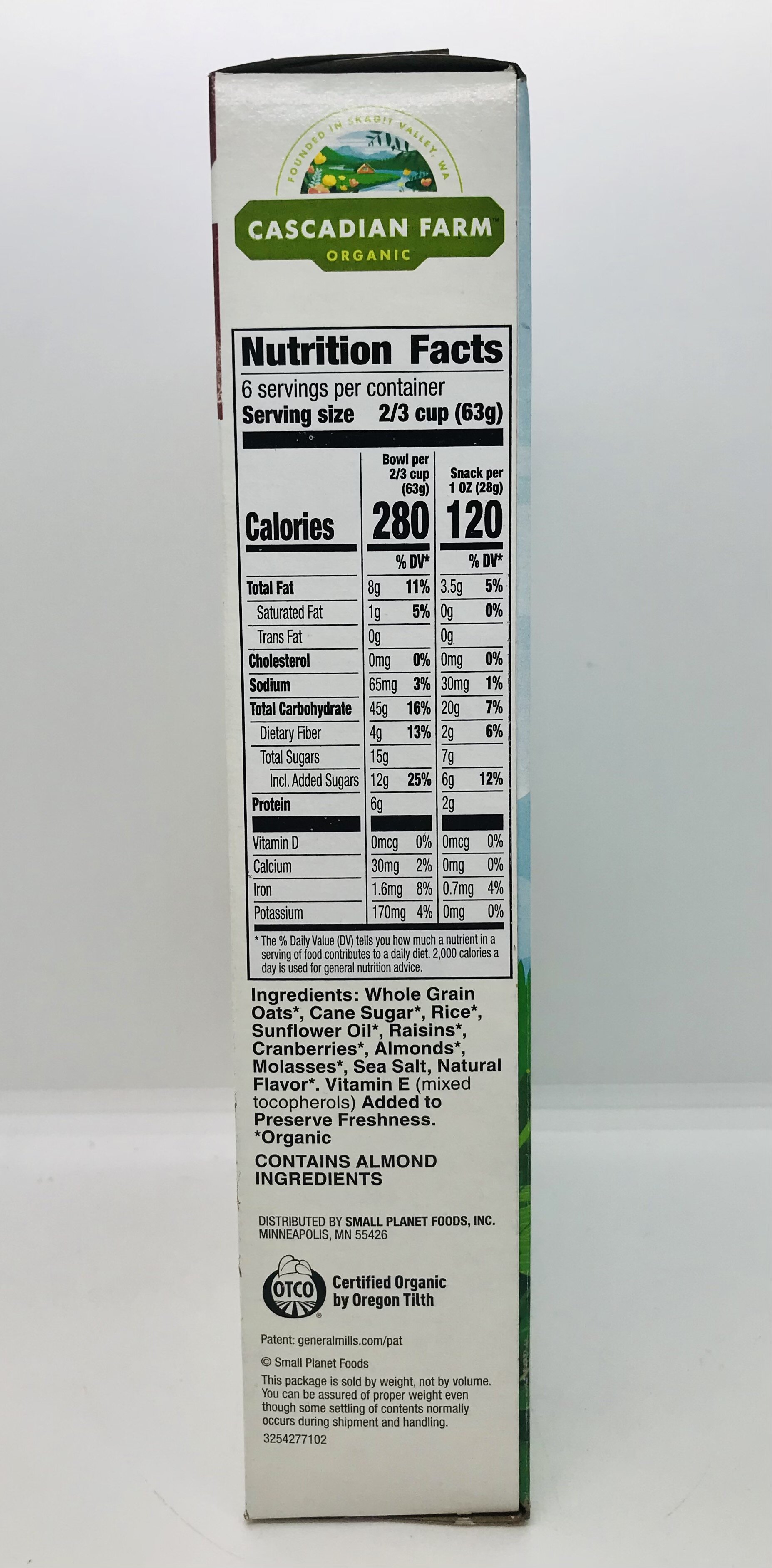Whole Grain Oats, Cane Sugar, Rice Sunflower Oil, Raisins Cranberries, Almonds Molasses, Sea Salt, Natural Flavor. Vitamin E (mixed tocopherols) Added to Preserve Freshness.