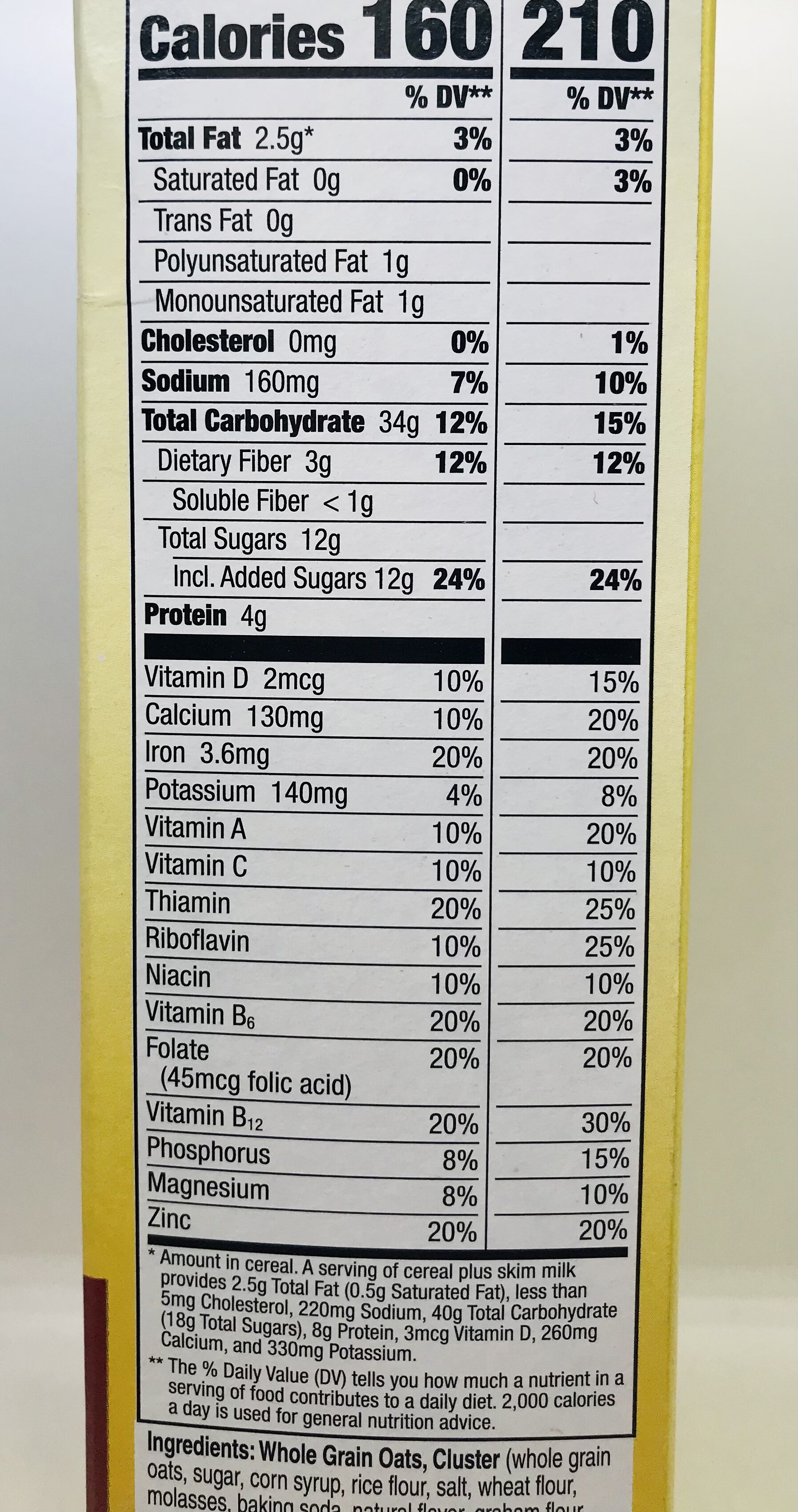 Whole Grain Oats, Cluster (whole grain oats, sugar, corn syrup, rice flour, salt, wheat flour, molasses, baking soda, natural flavor, graham flour, canola oil, barley malt extract, honey. Vitamin E (mixed tocopherols) added to preserve freshness), Sugar, Whole Grain Wheat, Brown Sugar Syrup, Honey, Corn Starch, Salt, Canola and/or Sunflower Oil, Tripotassium Phosphate, Natural Almond Flavor, Annatto Extract (color). Vitamin E (mixed tocopherols) Added to Preserve Freshness.