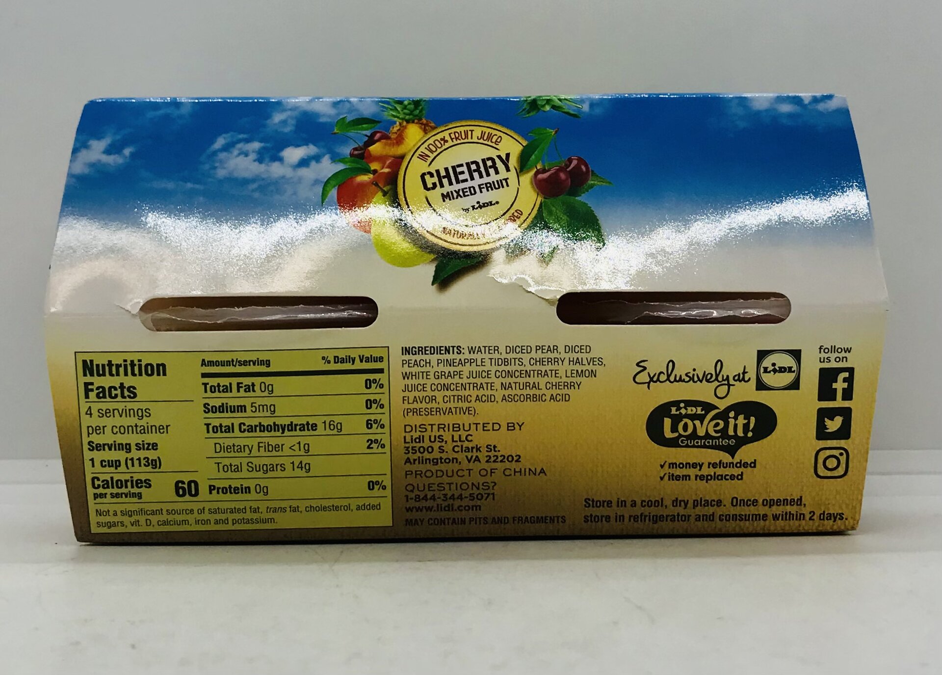 Water, diced pear, diced peach, pineapple tidbits, cherry halves, white grape juice concentrate, lemon juice concentrate, natural cherry flavor, citric acid, ascorbic acid.