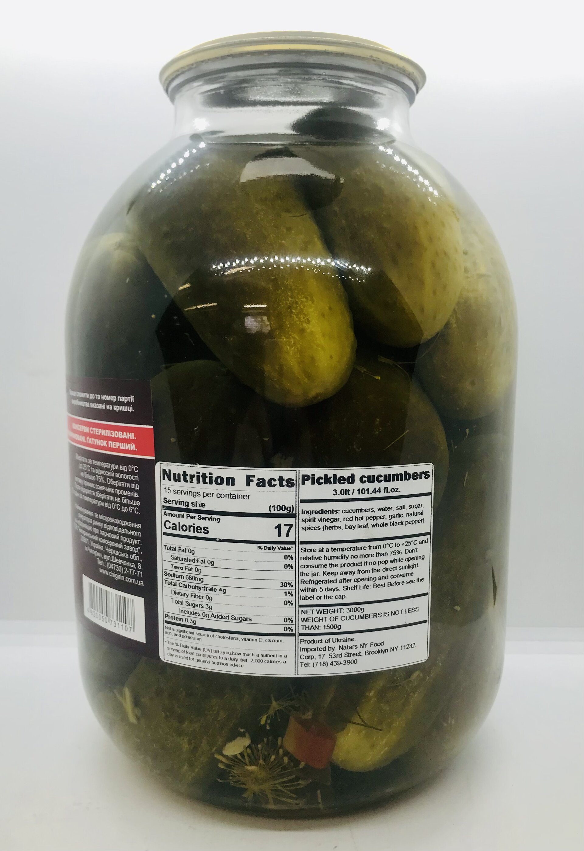 Cucumbers, water, salt, sugar, spirit vinegar, red hot pepper, garlic, natural spices (herbs, bay leaf, whole black pepper).