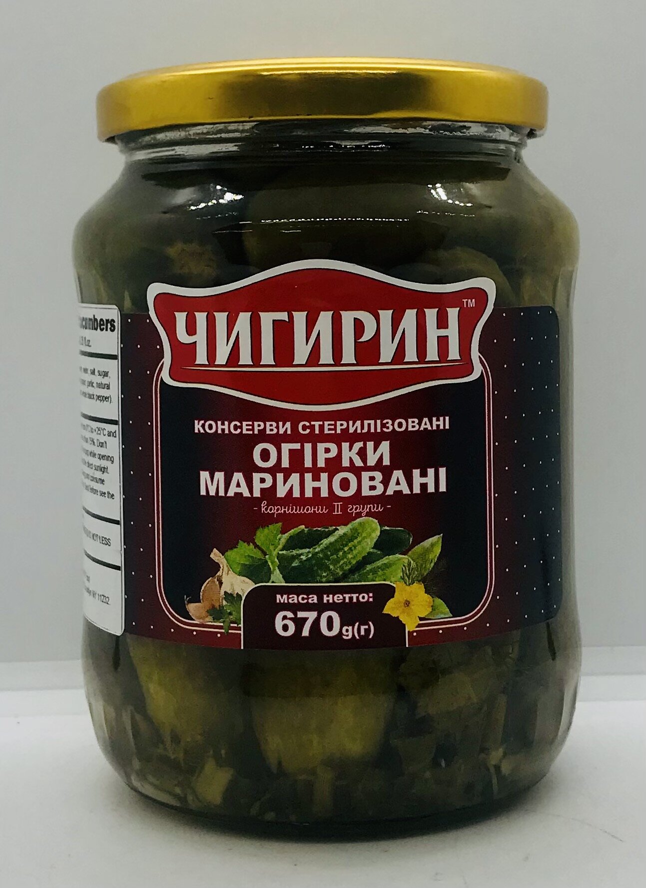 Cucumbers, water, salt, sugar, spirit vinegar, red hot pepper, garlic, natural spices.