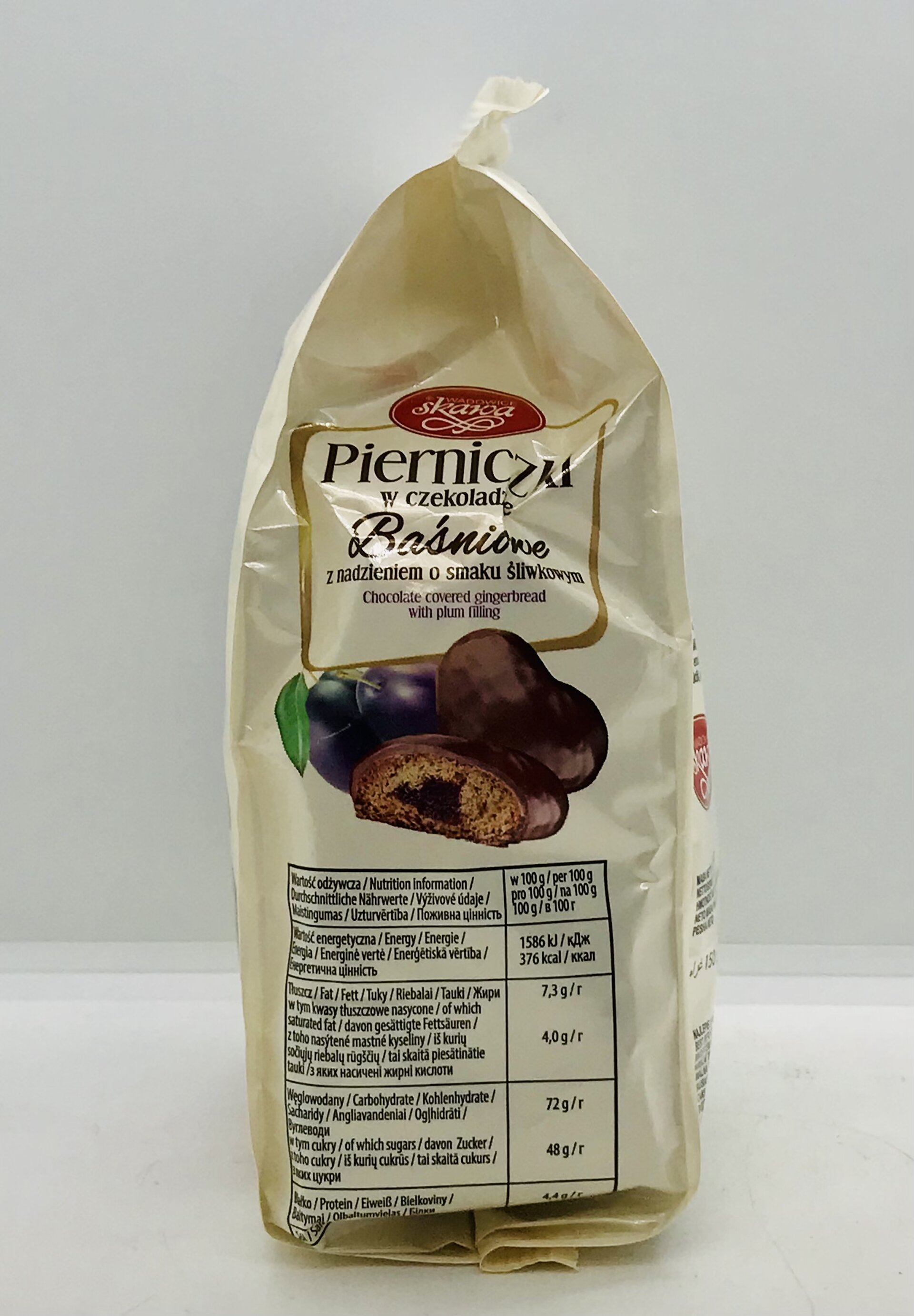 Sugar, wheat flour, chocolate 18% [sugar, cocoa paste, cocoa butter, emulsifiers: lecithin (from soya) and E 476; flavour], apple pulp, plum pulp 4%, raising agents (E 503, E500), spices, acidity regulators (citric acid, lactic acid), colour E 150 c, rape oil, flavour, gelling agent: pectin, preservative E 202.