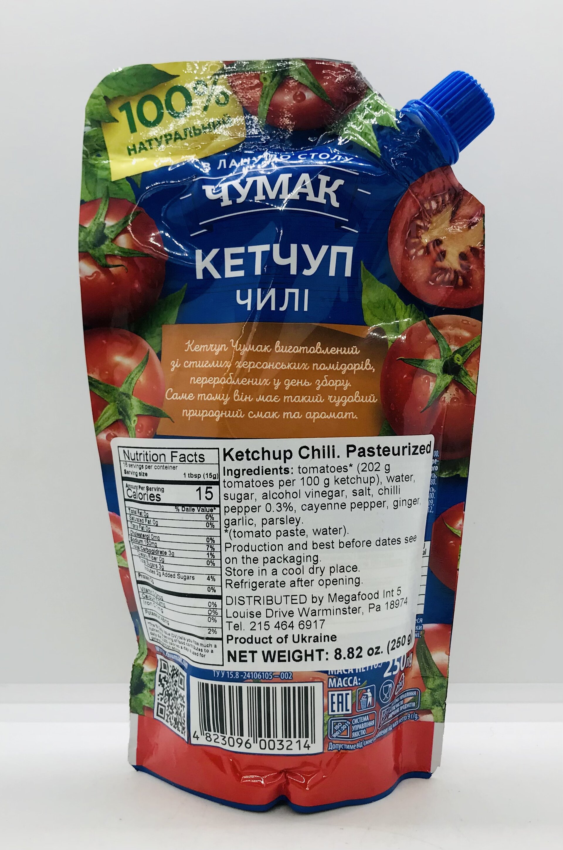 Tomatoes* (202 g tomatoes per 100 g ketchup), water, sugar, alcohol vinegar, salt, chili pepper 0.3%, cayenne pepper, ginger, garlic, parsley.