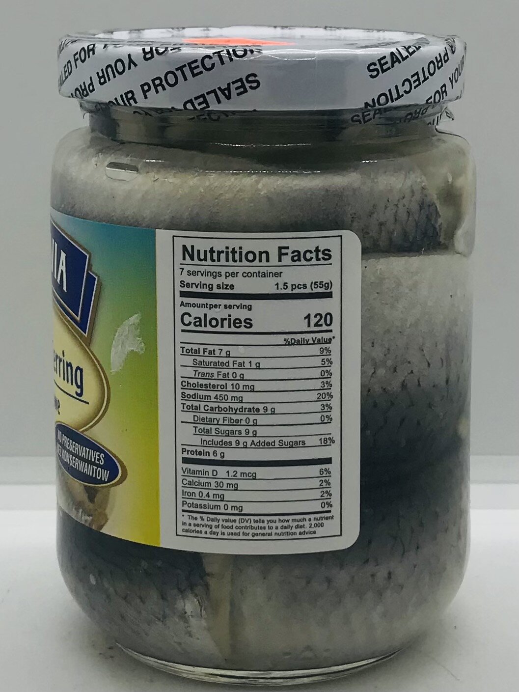 Herring, water, sugar, onions, vinegar, salt, spices.