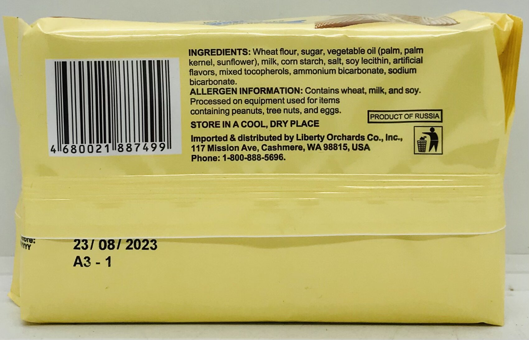 Wheat flour, sugar, vegetable oil (palm, palm kernel, sunflower), milk, corn starch, salt, soy lecithin, artificial flavors, mixed tocopherols, ammonium bicarbonate, sodium bicarbonate.