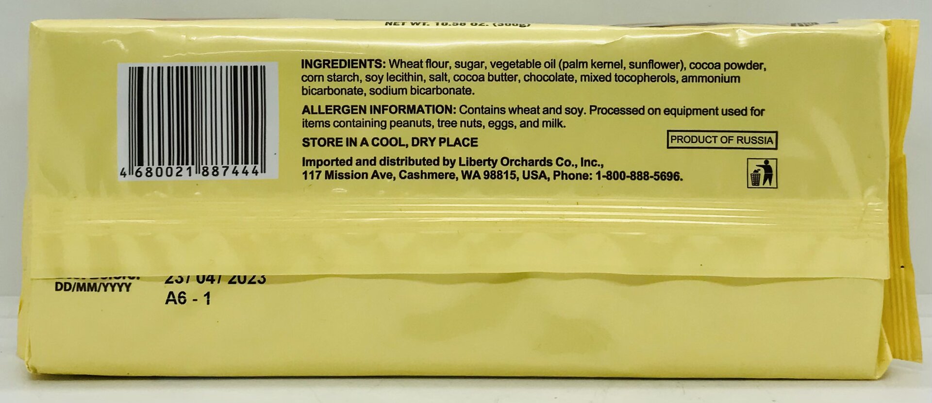 Wheat flour, sugar, vegetable oil (palm kernel, sunflower), cocoa powder, com starch, soy lecithin, salt, cocoa butter, chocolate, mixed tocopherols, ammonium bicarbonate, sodium bicarbonate.