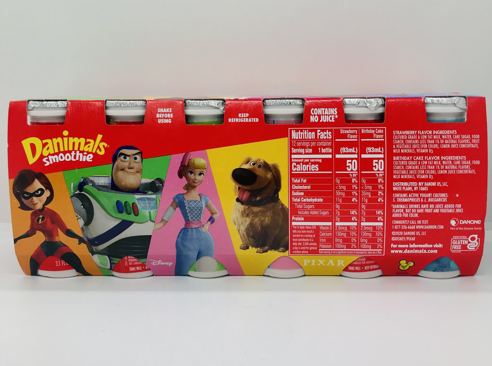 Birthday cake flavor: Cultured grade A low fat milk, water, cane sugar, food starch, contains less than 1% of natural flavors, fruit & vegetable juice, lemon juice concentrate, milk minerals, vitamin D3.
