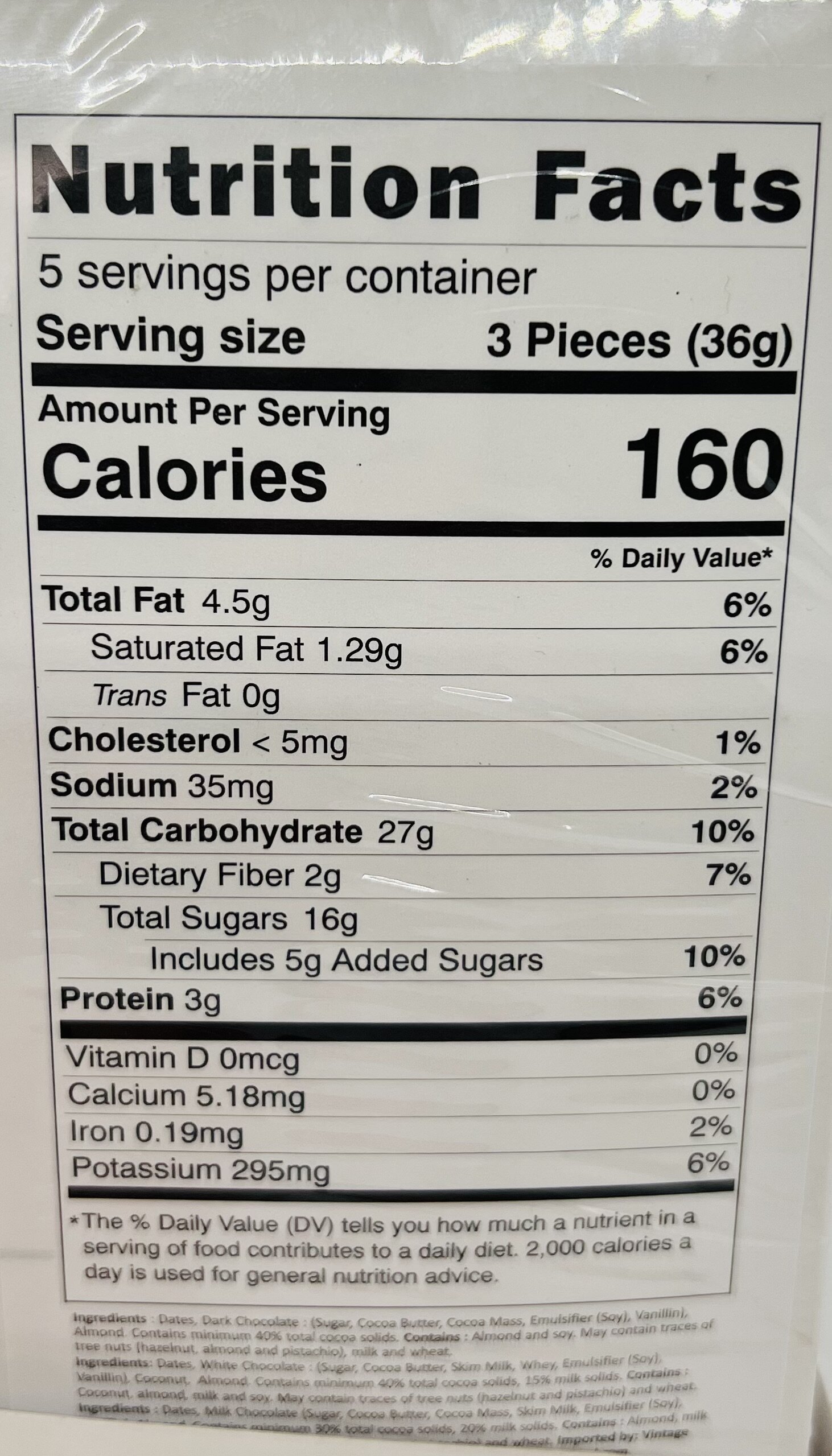 Ingredients: Dates, White Chocolate: (Sugar, Cocoa Butter, Skim Milk, Whey, Emulsifier (Soy) Vanillin), Coconut, Almond. Contains minimum 40% total cocoa solids, 15% milk solids. Contains: Coconut, almond, milk and soy. May contain traces of tree nuts (hazelnut and pistachio) and wheat.