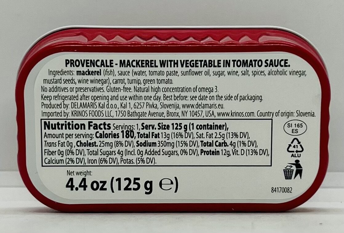 Mackerel (fish), sauce (water, tomato paste, sunflower oil, sugar, wine, salt, spices, alcoholic vinegar, mustard seeds, wine vinegar), carrot, turnip, green tomato.