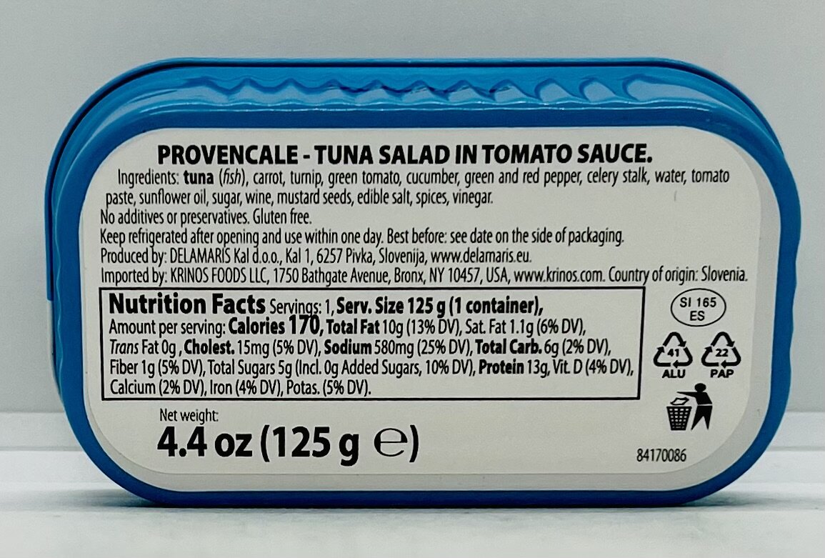 Tuna (fish), carrot, turnip, green tomato, cucumber, green and red pepper, celery stalk, water, tomato paste, sunflower oil, sugar, wine, mustard seeds, edible salt, spices, vinegar.