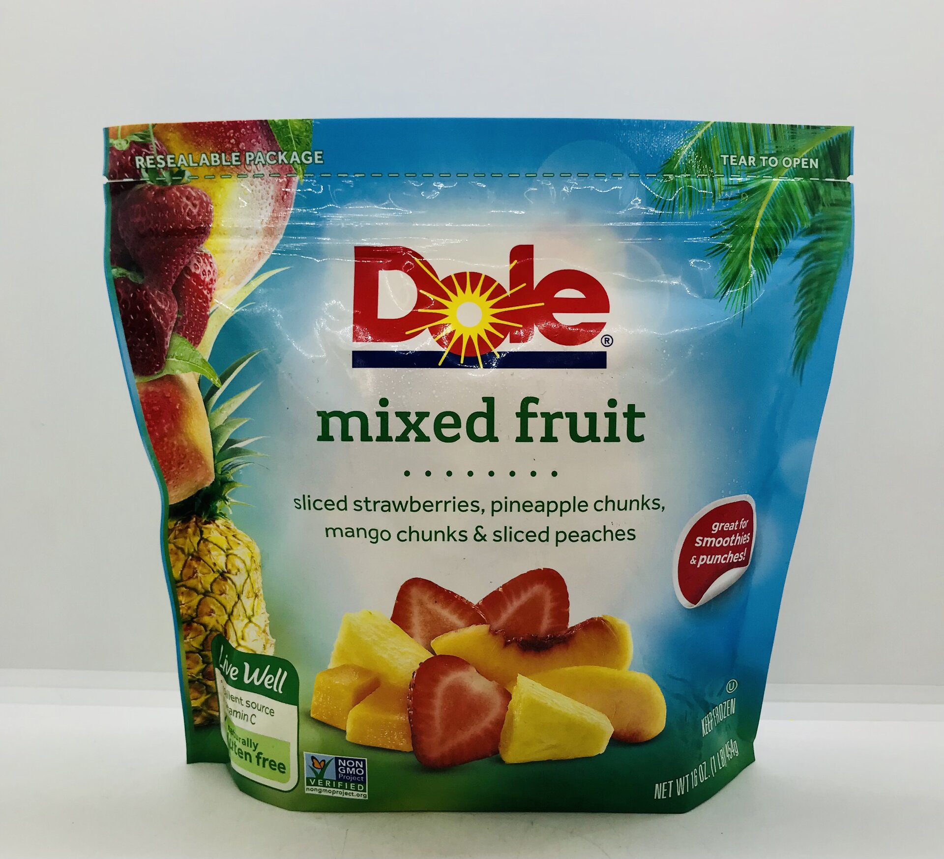 Sliced Strawberries, Pineapple chunks, Mango chunks & Sliced Peaches, ascorbic acid (to promote color retention), citric acid, malic acid, and natural flavors.