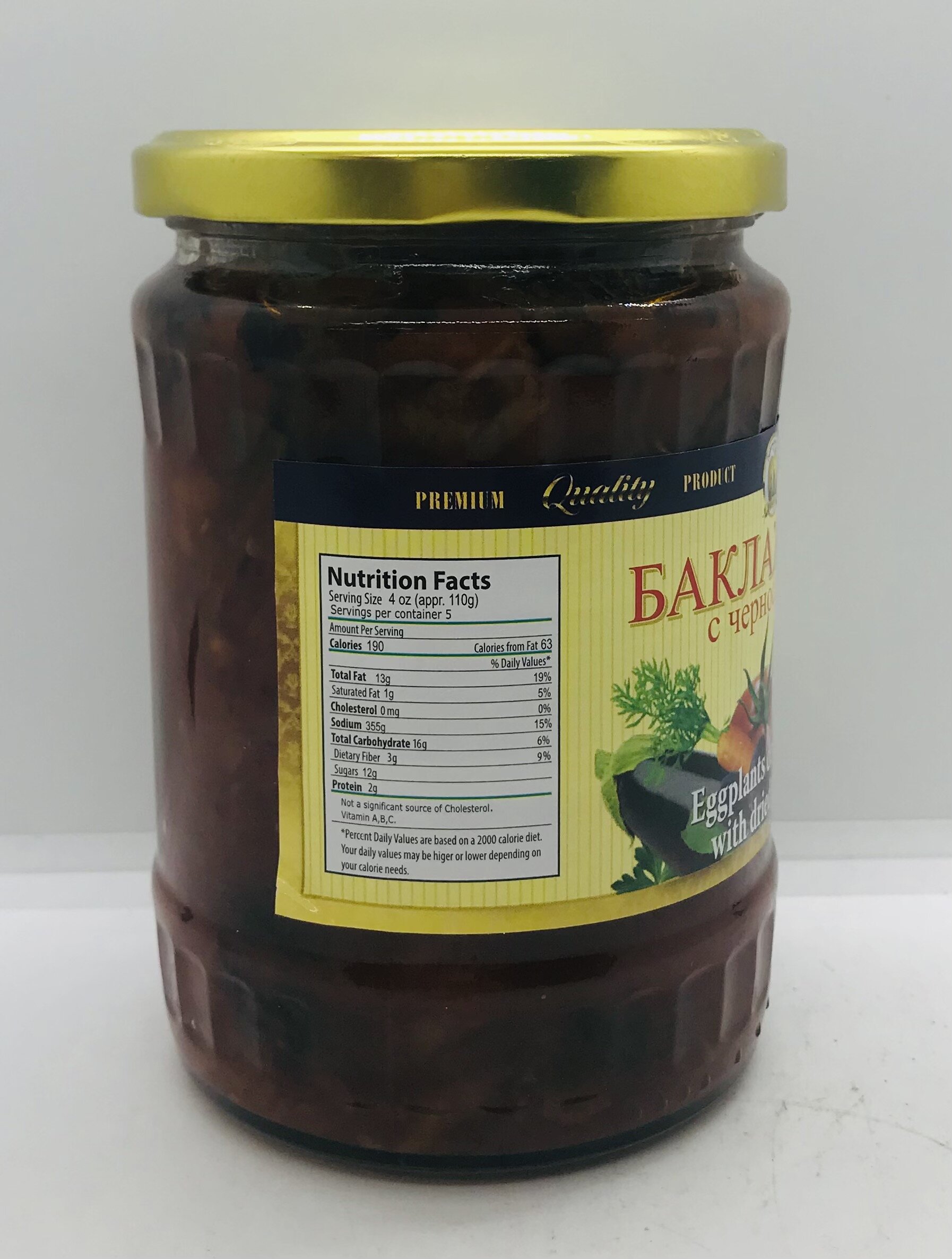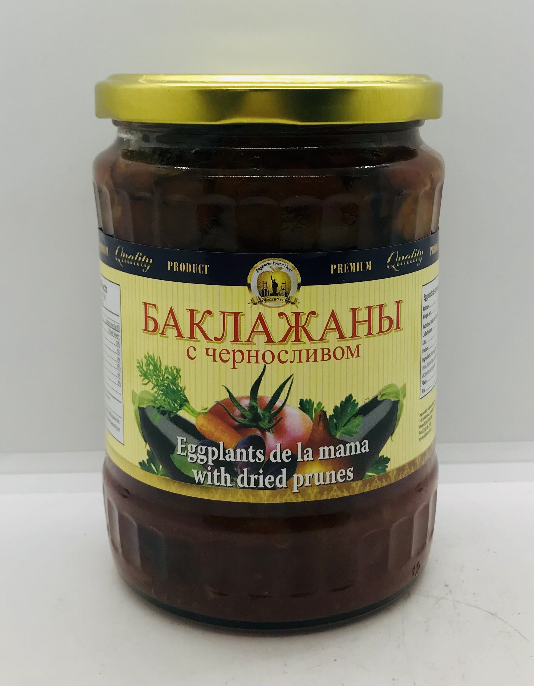 Fried eggplant, dried prunes, carrot, sugar, onion, tomato paste, sunflower oil, red pepper, salt, potato starch, spices.
