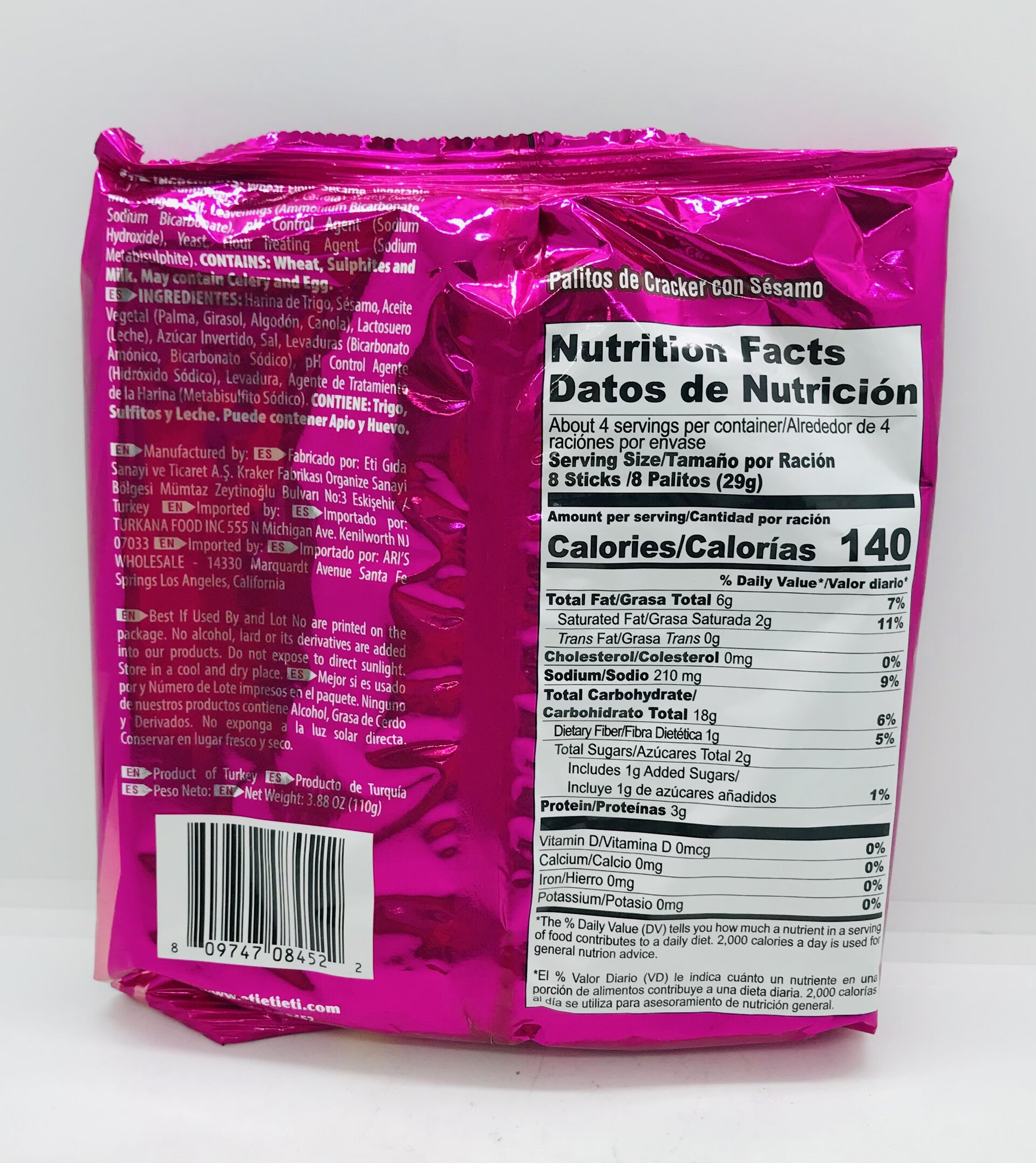 Wheat flour Sesame, Vegetable Oil (Palm, Sunflower, Cottonseed, Canola), Whey (Milk), Invert Sugar, Salt, Leavenings (Ammonium Bicarbonate, Sodium Bicarbonate), pH Control Agent (Sodium Hydroxide), Yeast Flour Treating Agent (Sodium Metabisulphite).