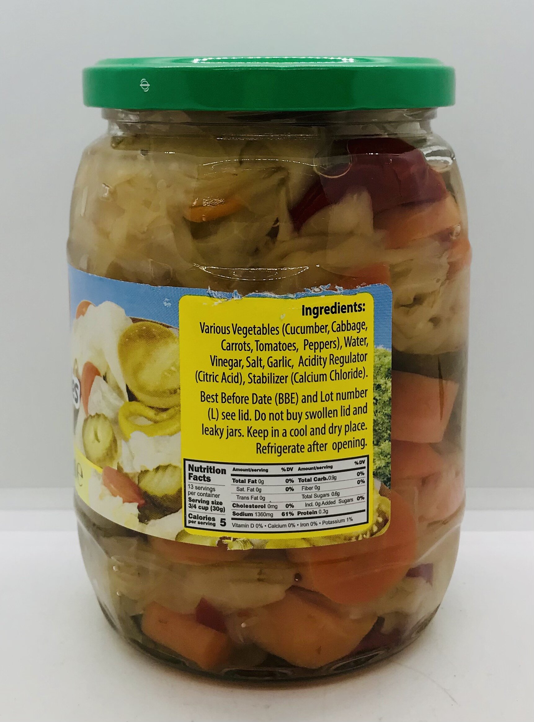 Various vegetables (cucumber cabbage, carrots, tomatoes, peppers), water, vinegar, salt, garlic, acidity regulator, stabilizer.