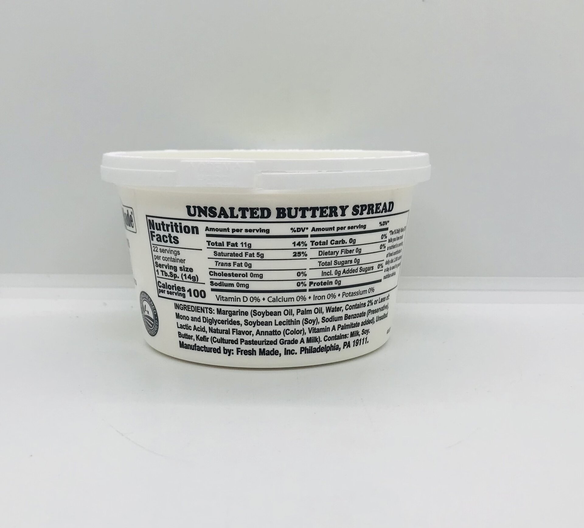 Margarine (Soybean Oil, Palm Oil, Water, Contains 2% or Less of; Now and Diglycerides, Soybean Lecithin (Soy), Sodium Benzoate (Preservative), latic Acid, Natural Flavor, Annatto (Color), Vitamin A Palmitate added), Unsalted Bitter, Kefir (Cultured Pasteurized Grade A Milk). Contains: Milk, Soy, Vantactured by: Fresh Made, Inc. Philadelphia, PA 19111.