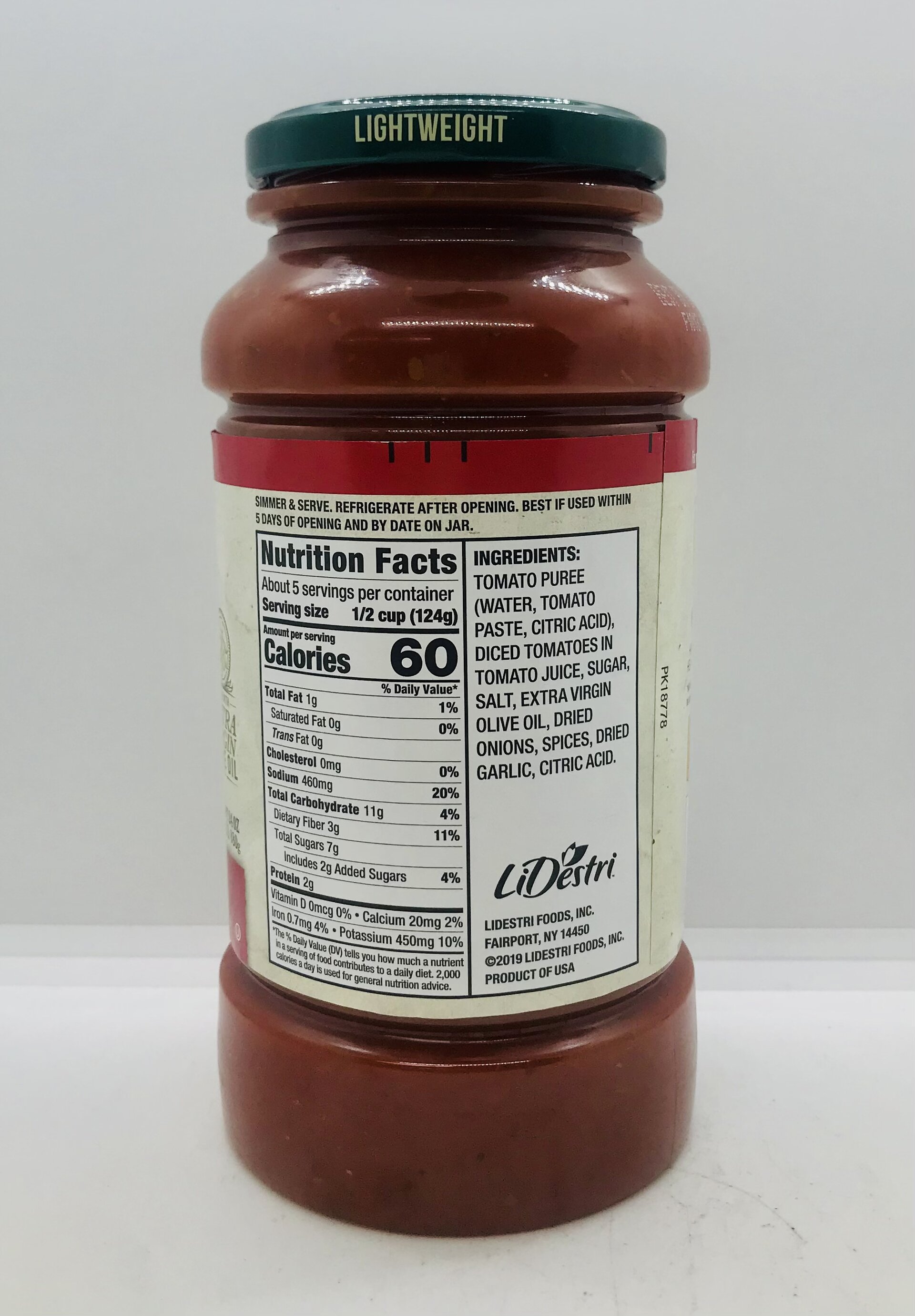 TOMATO PUREE (WATER, TOMATO PASTE, CITRIC ACID), DICED TOMATOES IN TOMATO JUICE, SUGAR, SALT, EXTRA VIRGIN OLIVE OIL, DRIED ONIONS, SPICES, DRIED GARLIC, CITRIC ACID.