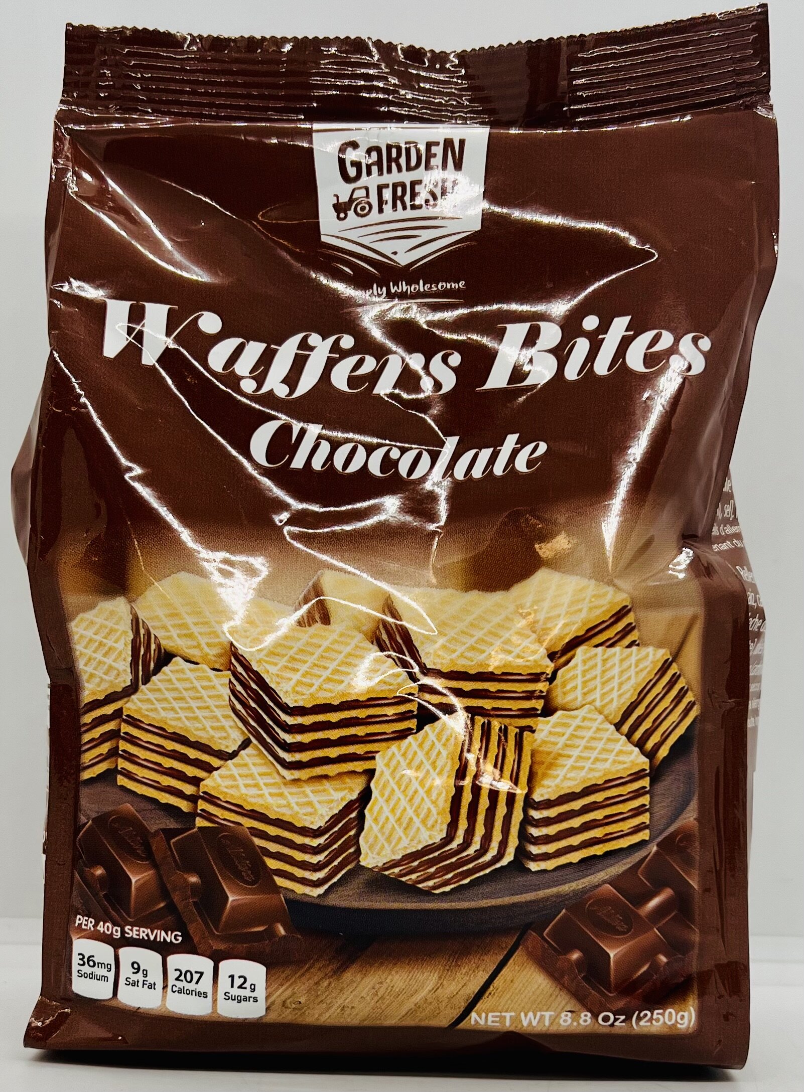Chocolate Flavored filling (70%) ((Sugar, Palm oil, maize Starch, fat reduced cocoa powder (4%), cocoa mass (2%), Skimmed Milk Powder, Emulsifier (Soya Lecithin), Flavoring).] Wafer (30%) [Wheat Flour, Wheat Starch, Palm oil, Emulsifier (Soya Lecithin), Salt, Raising Agents (Sodium Carbonates, Ammonium carbonates).