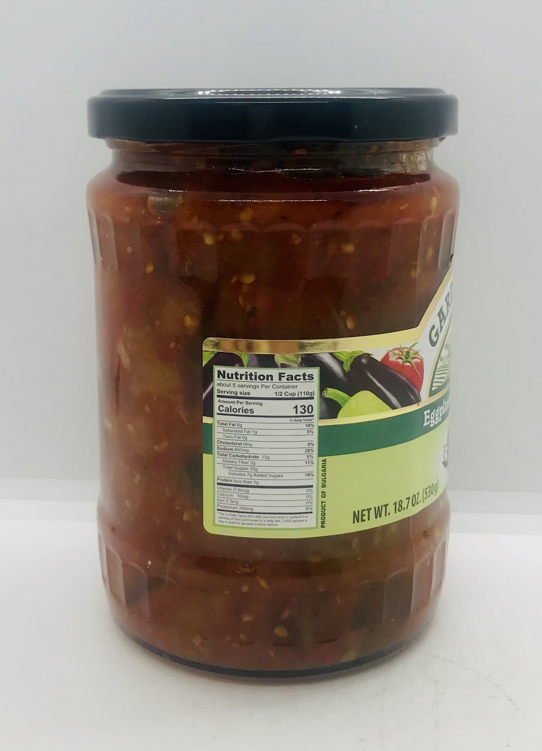 Eggplant, peppers, water, sunflower oil, sugar, tomato paste, salt, acetic acid, garlic, natural capsicum flavoring.