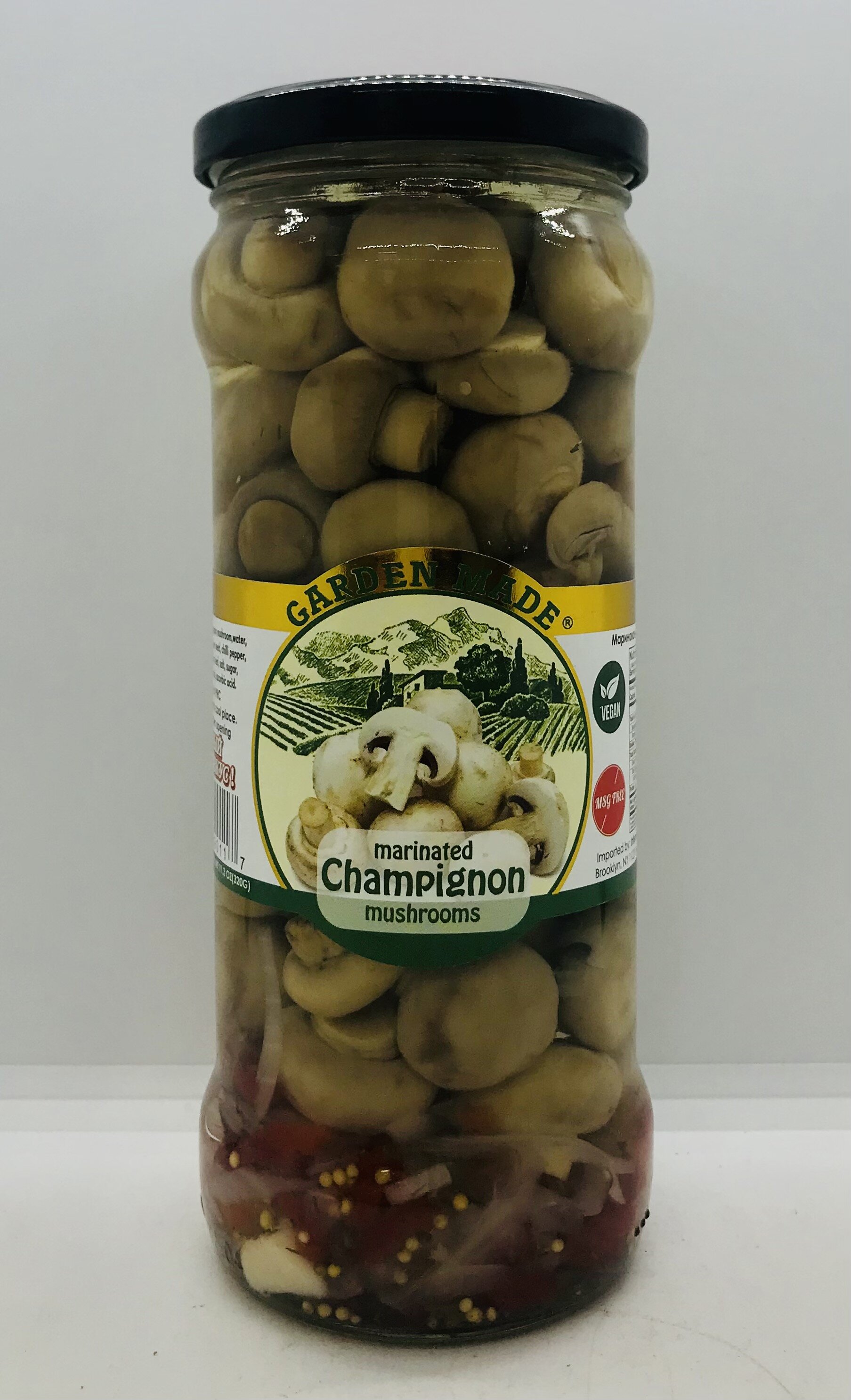 Champignon mushroom, water, onion, garlic, black pepper seed, chili pepper, mustard seed, dill, bay leaf, salt, sugar, citric acid, acetic acid, ascorbic acid.