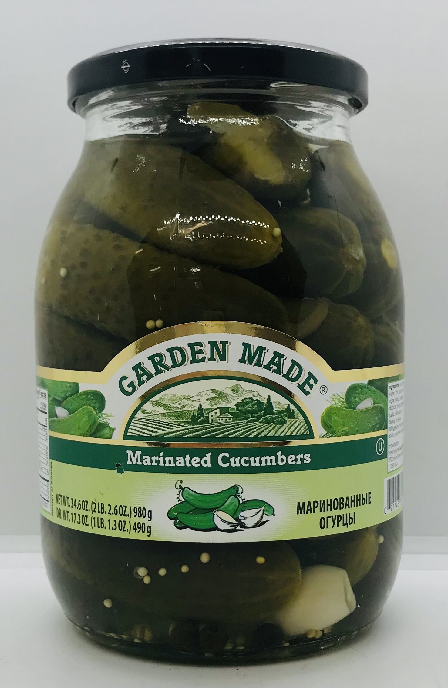 Cucumbers, water, salt, acetic acid, sugar, black pepper, allspice, mustard seeds, garlic, dillweed oil.