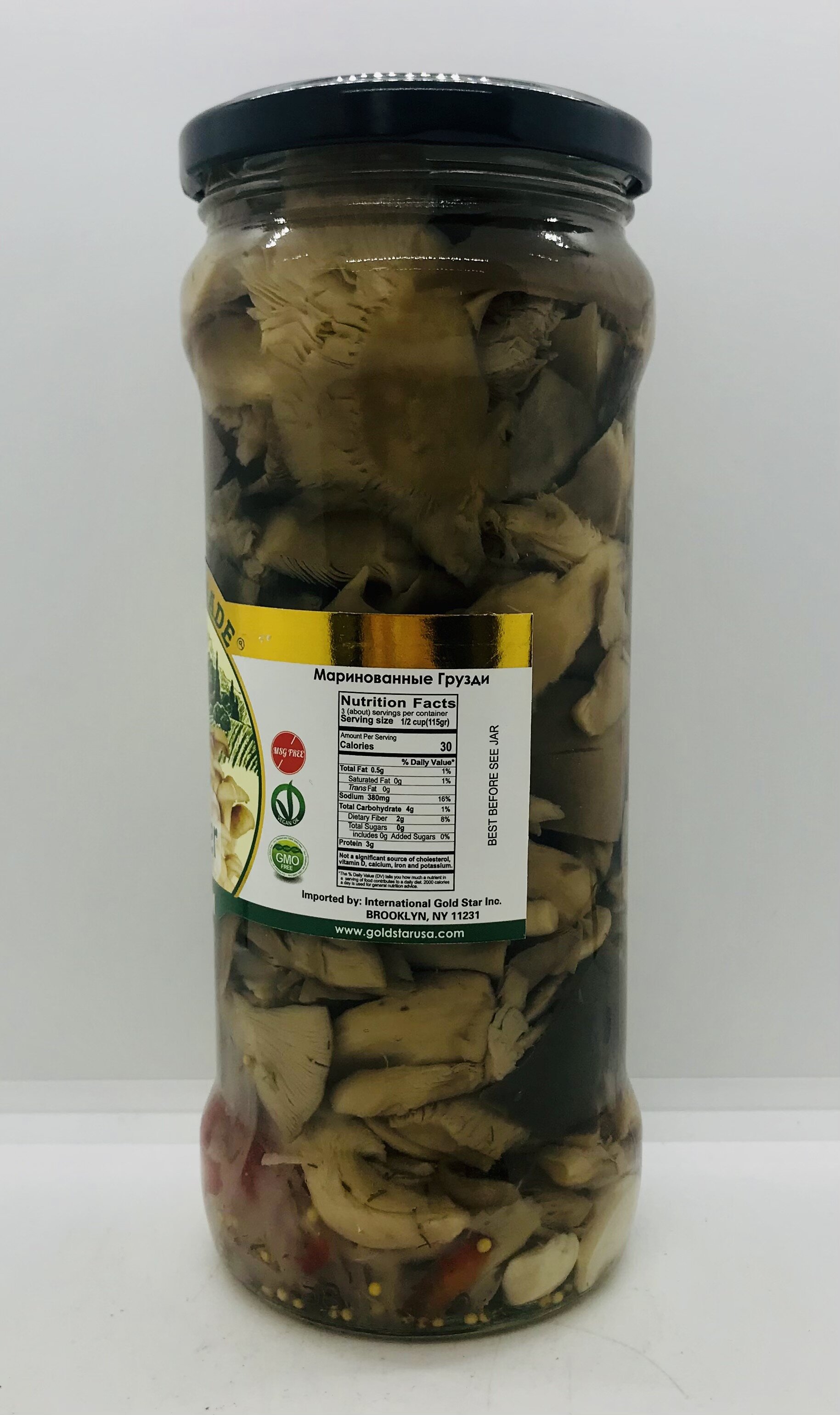 Oyster mushroom, water, onion, garlic, black pepper seed, chili pepper, mustard seed, dill, bay leaf, salt, sugar, citric acid, acetic acid, ascorbic acid.