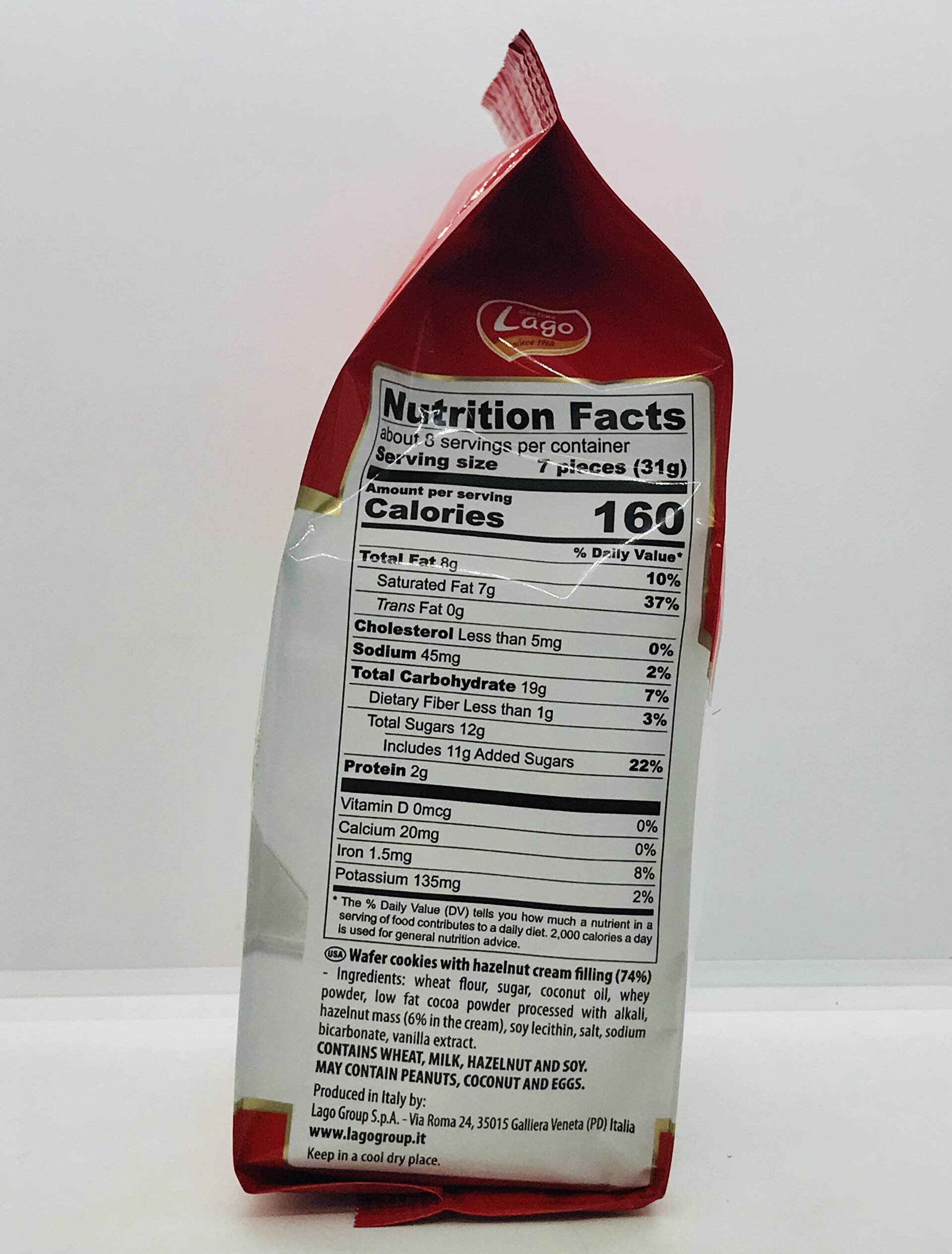 Wheat flour, sugar, coconut oil, whey powder, low fat cocoa powder processed with alkali, hazelnut mass (6% in the cream), soy lecithin, salt, sodium bicarbonate, vanilla extract.