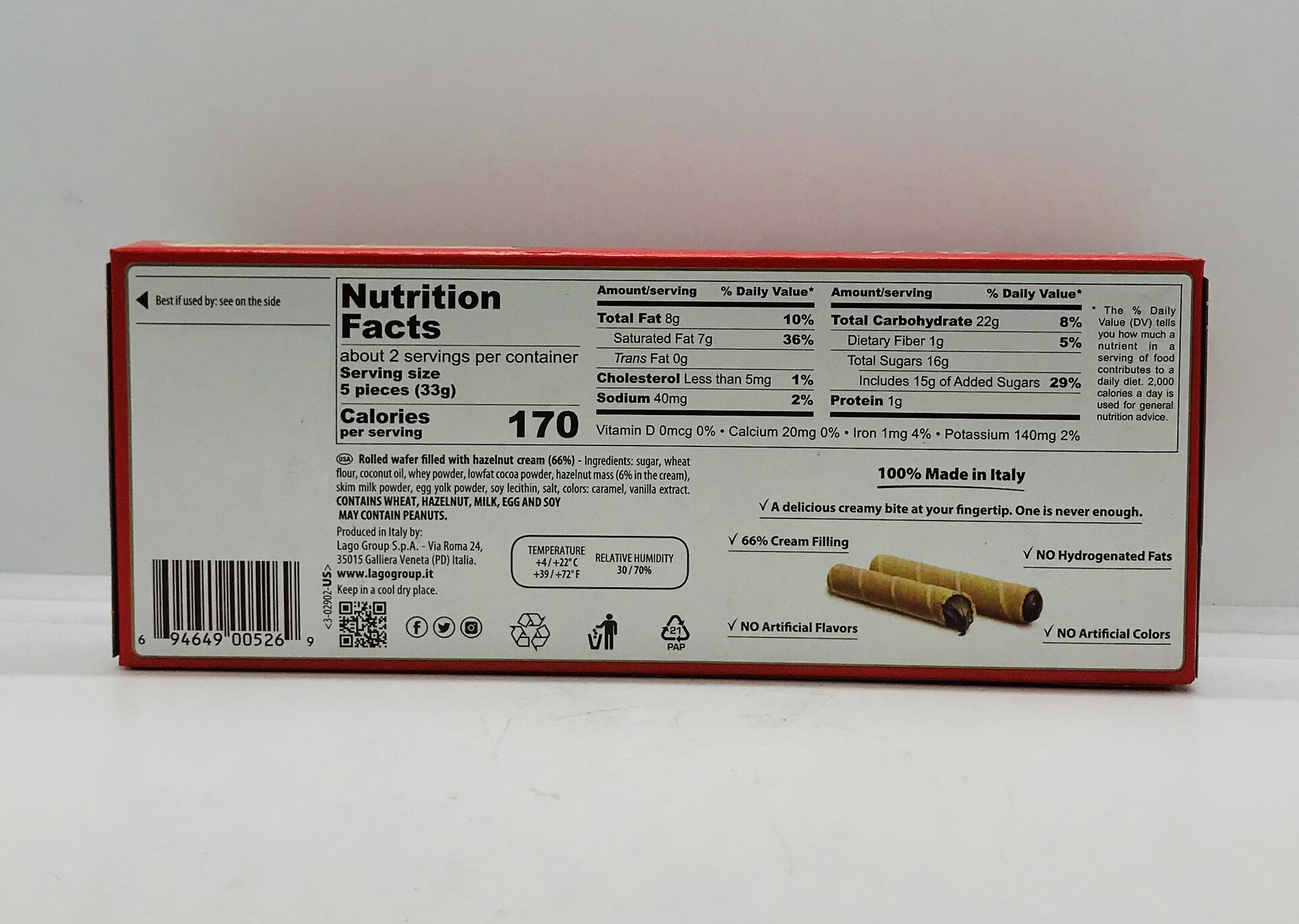 Sugar, wheat flour, coconut oil, whey powder, lowfat cocoa powder, hazelnut mass (69% in the cream), skim milk powder, egg yolk powder, soy lecithin, salt, colors: caramel, vanilla extract.