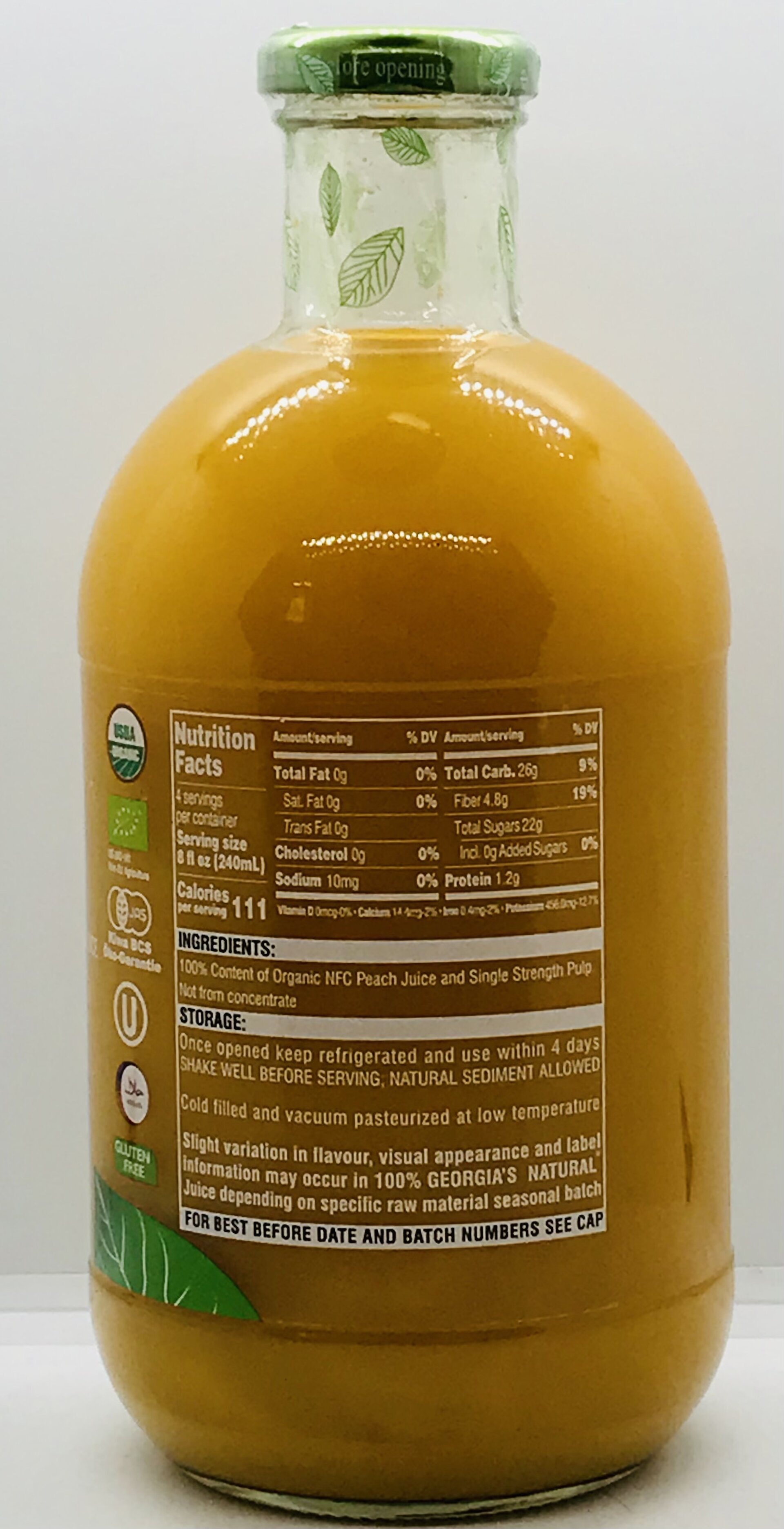 Content of organic NFC peach juice and single strength pulp.
