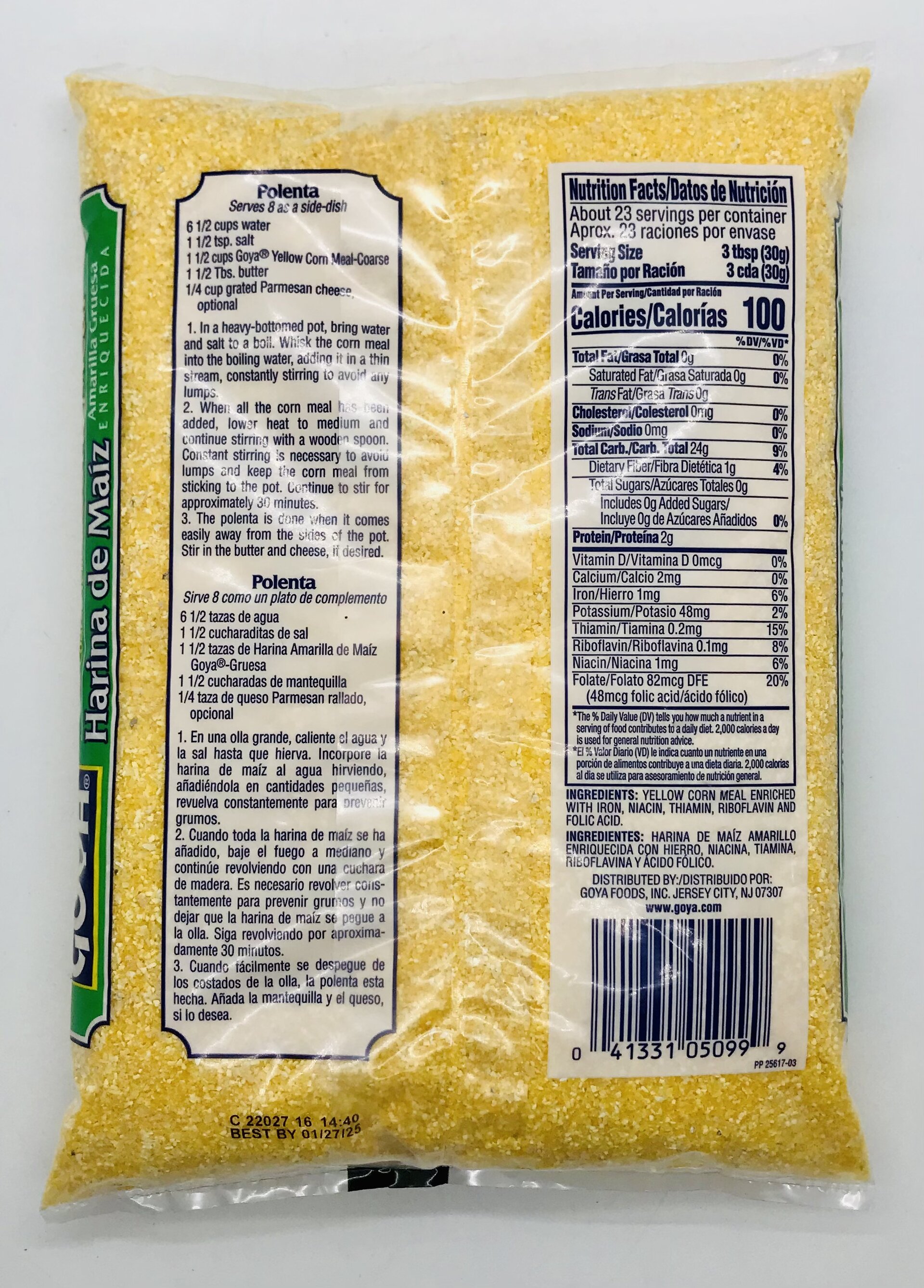 Yellow corn meal enriched with iron, niacin, thiamin, riboflavin and folic acid.